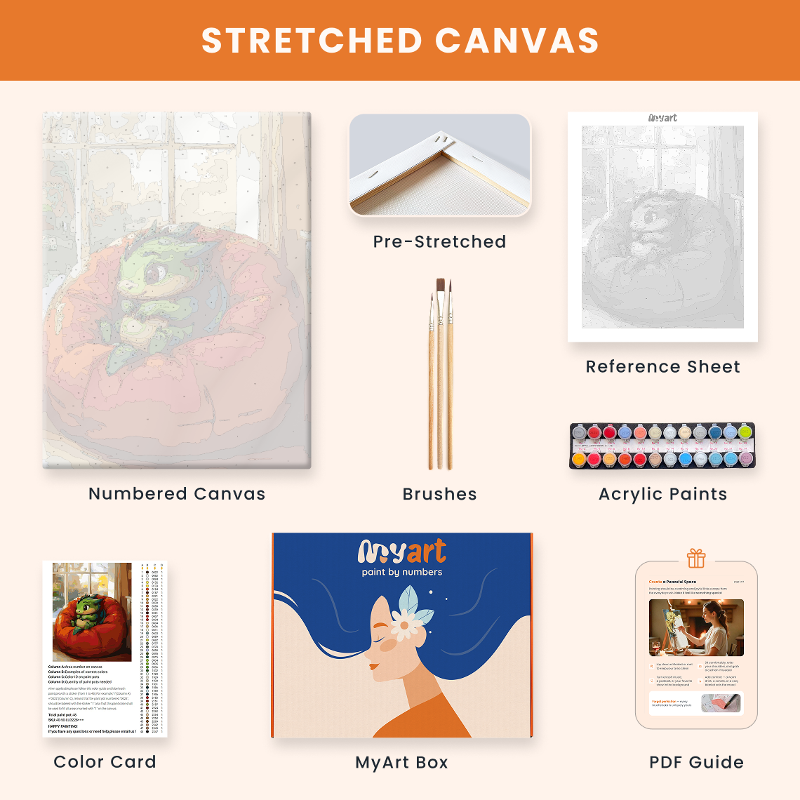 - Premium acrylic paint set (pre-mixed and numbered)