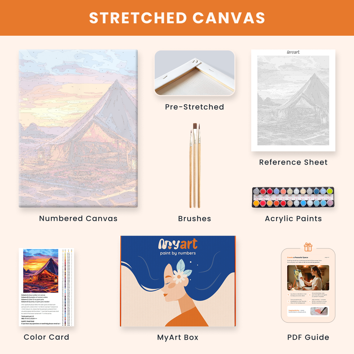 - Premium acrylic paint set (pre-mixed and numbered)