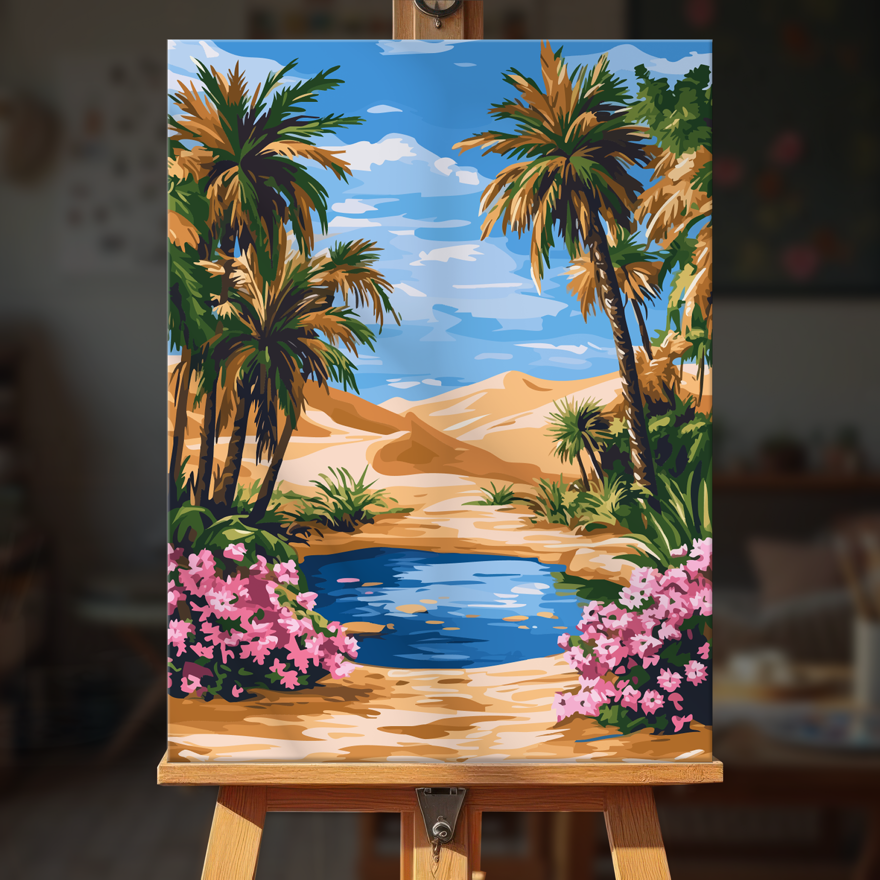 The canvas is pre-stretched on a wooden frame — ready to hang when finished.
