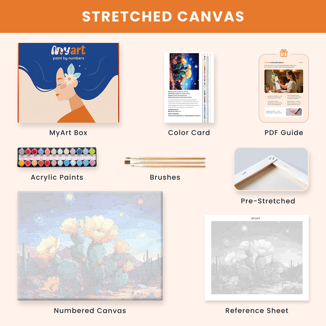 - Premium acrylic paint set (pre-mixed and numbered)