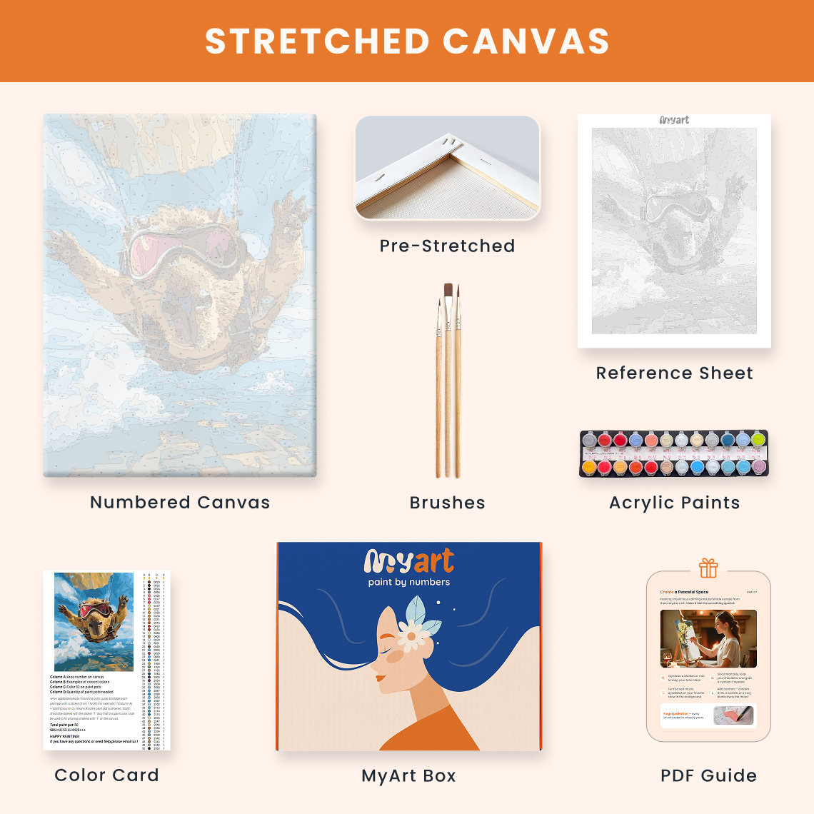 - Premium acrylic paint set (pre-mixed and numbered)