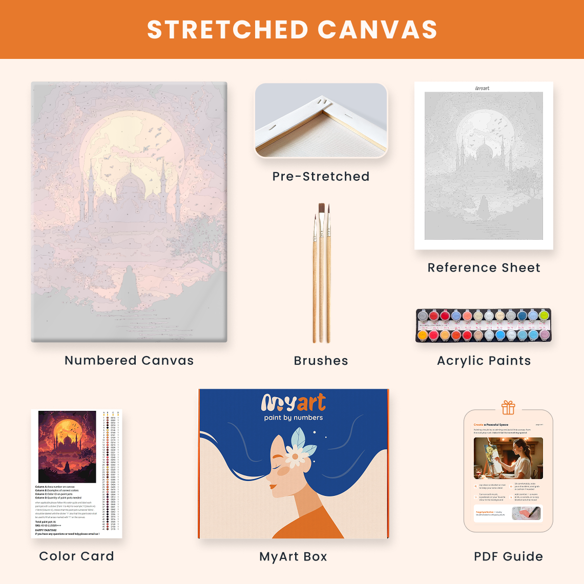 - Premium acrylic paint set (pre-mixed and numbered)
