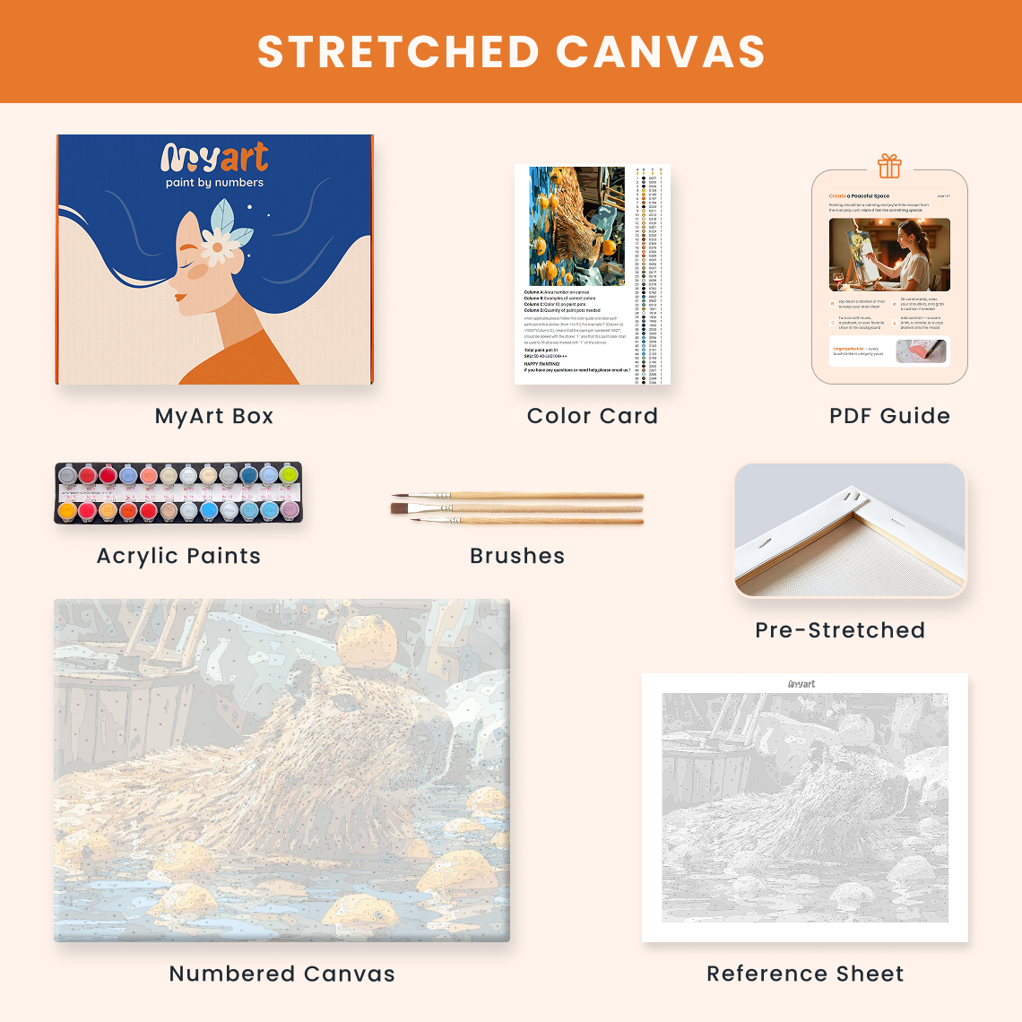 - Premium acrylic paint set (pre-mixed and numbered)