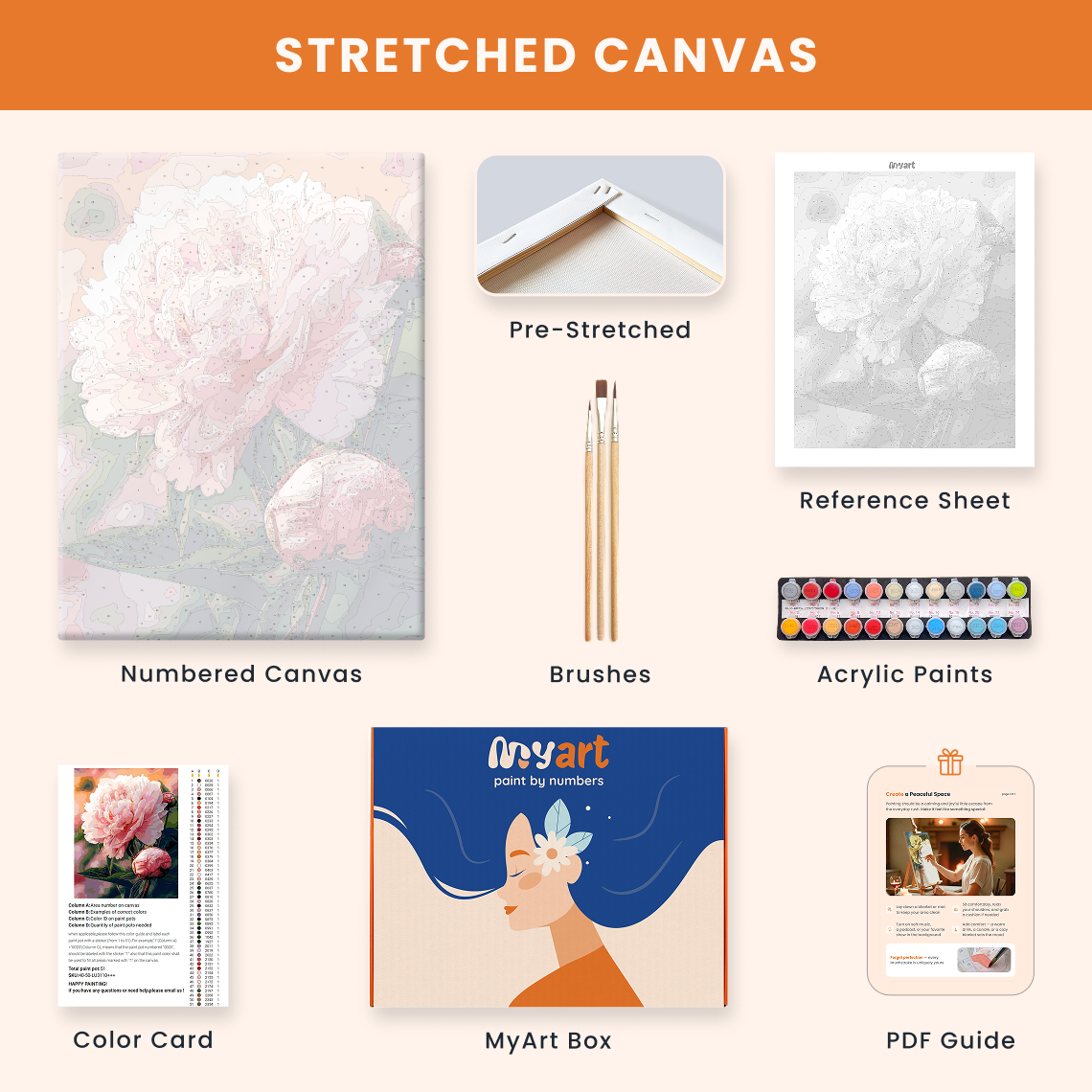 - Premium acrylic paint set (pre-mixed and numbered)