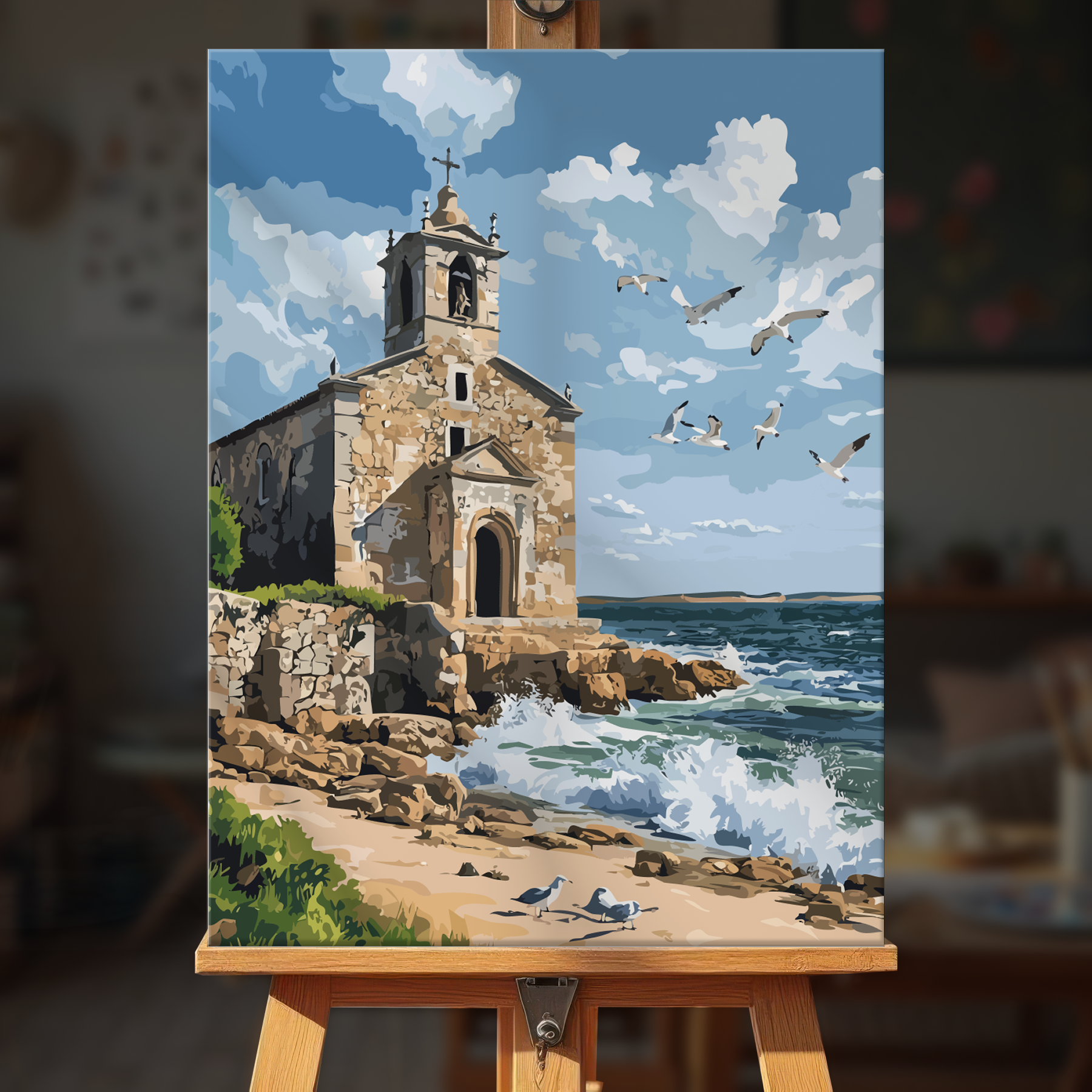 The canvas is pre-stretched on a wooden frame — ready to hang when finished.
