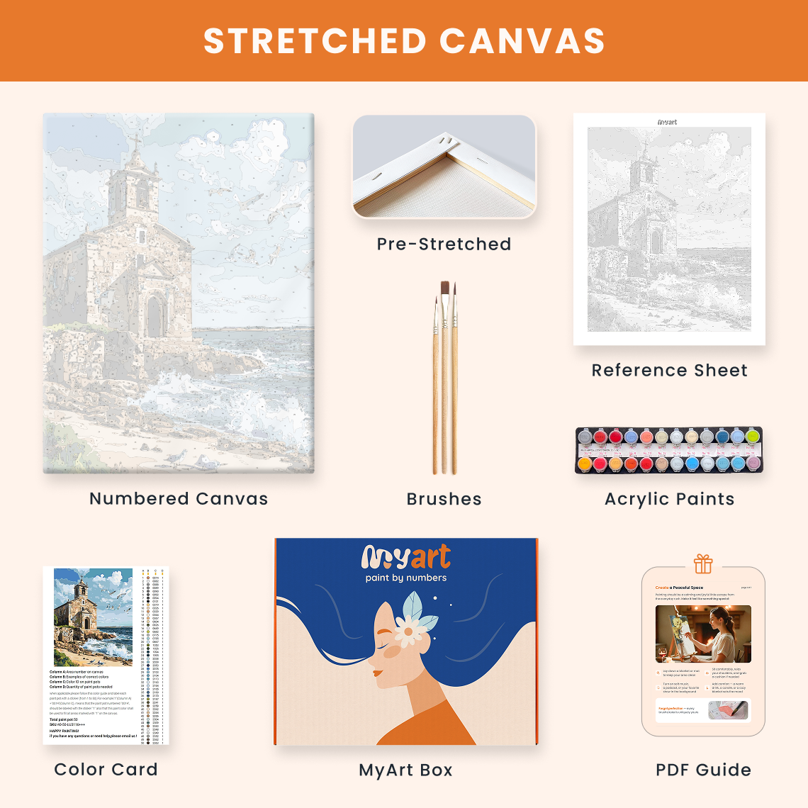 - Premium acrylic paint set (pre-mixed and numbered)
