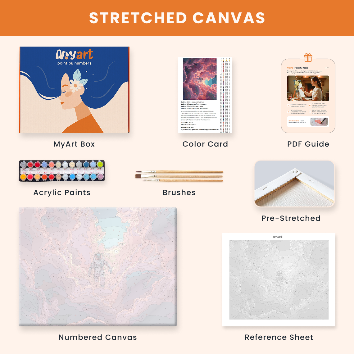 - Premium acrylic paint set (pre-mixed and numbered)