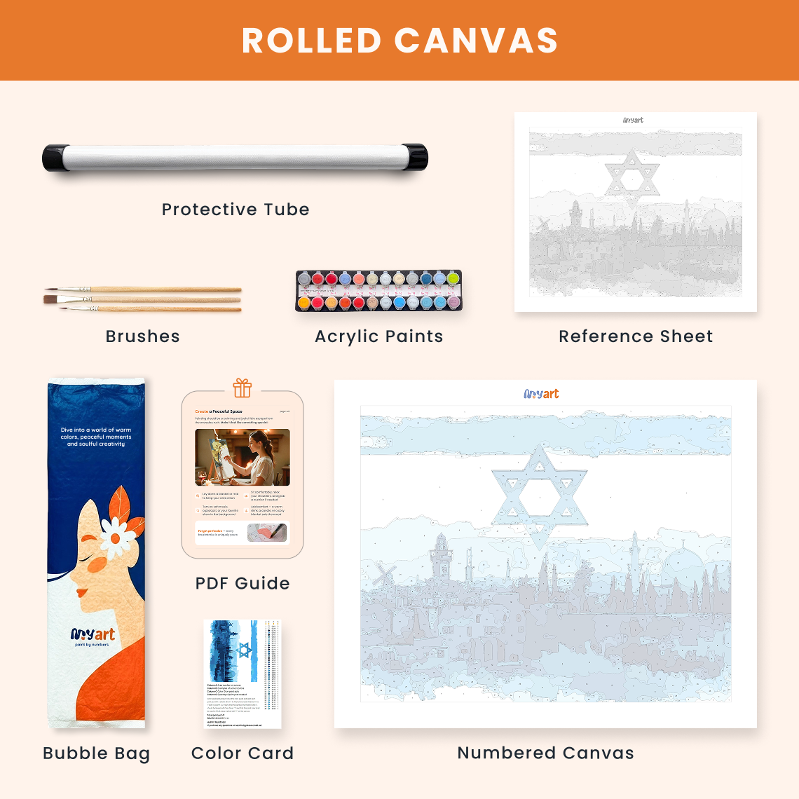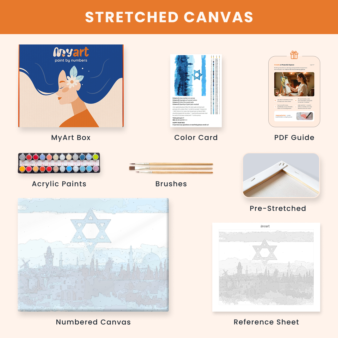 - Premium acrylic paint set (pre-mixed and numbered)