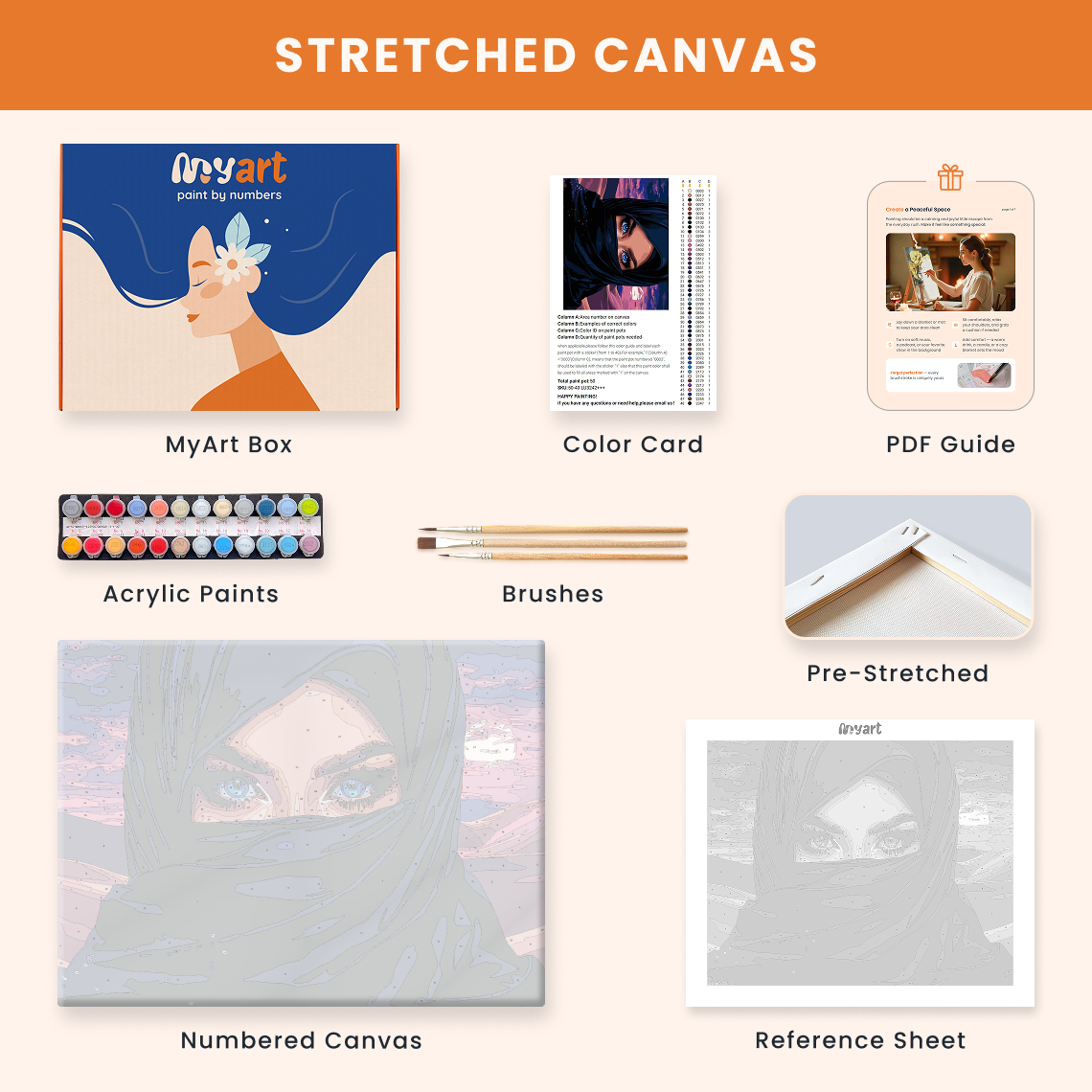 - Premium acrylic paint set (pre-mixed and numbered)