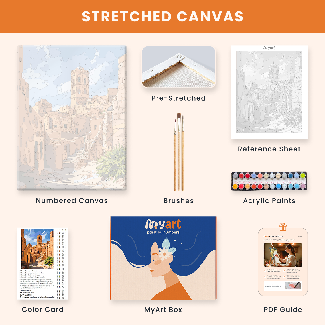 - Premium acrylic paint set (pre-mixed and numbered)