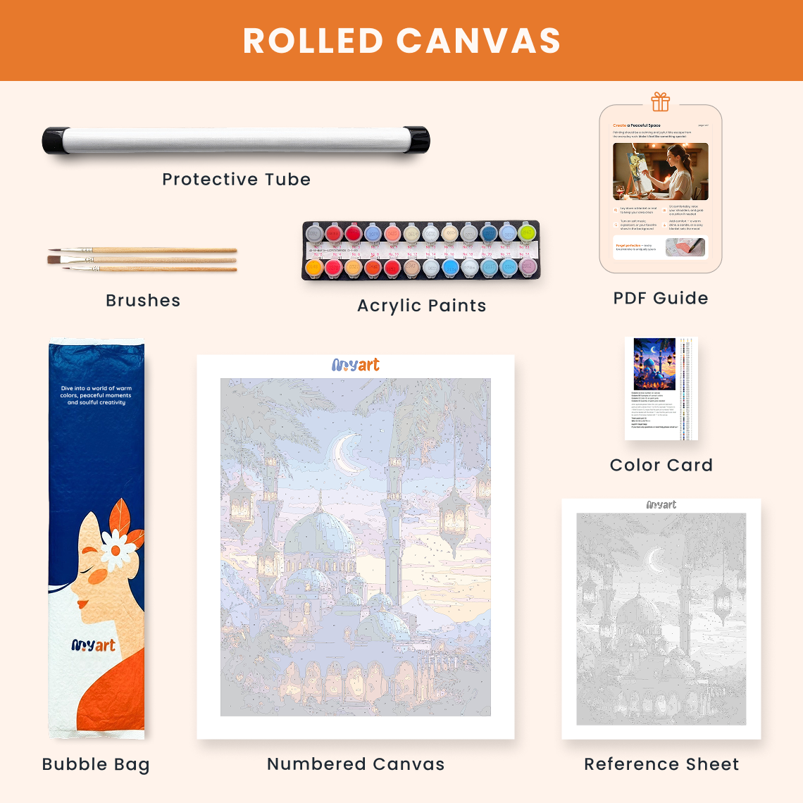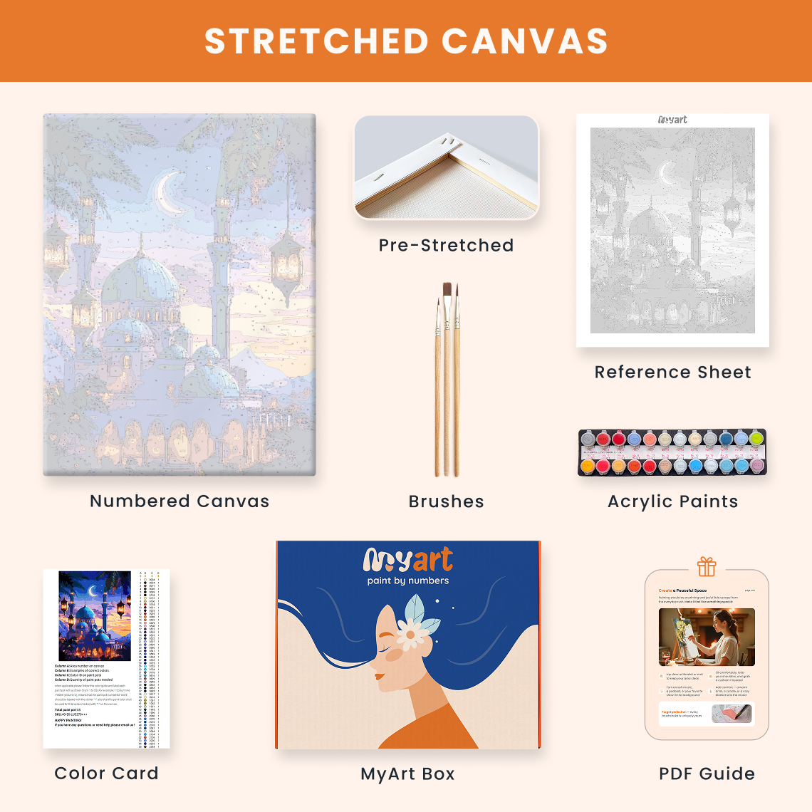 - Premium acrylic paint set (pre-mixed and numbered)
