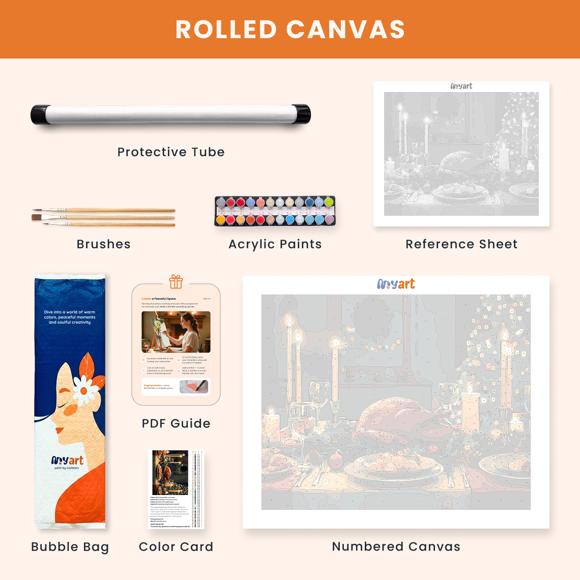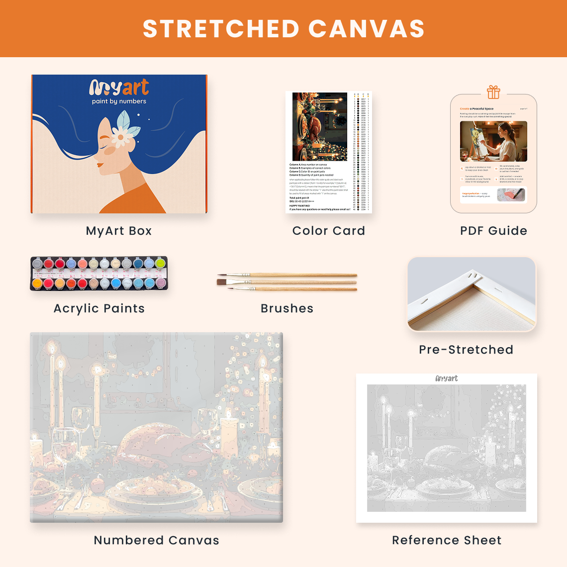 - Premium acrylic paint set (pre-mixed and numbered)