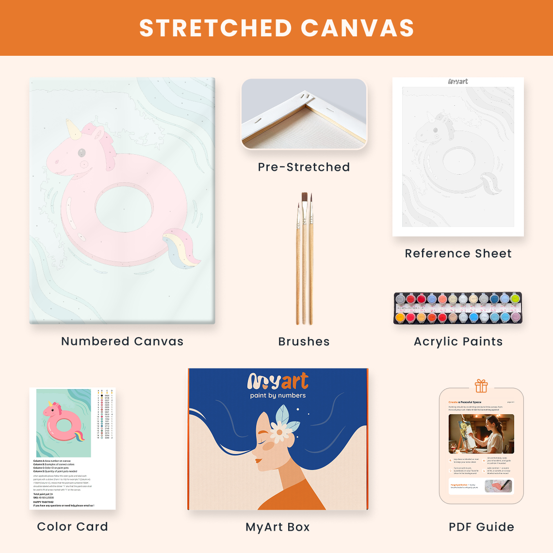 The canvas is pre-stretched on a wooden frame — ready to hang when finished.