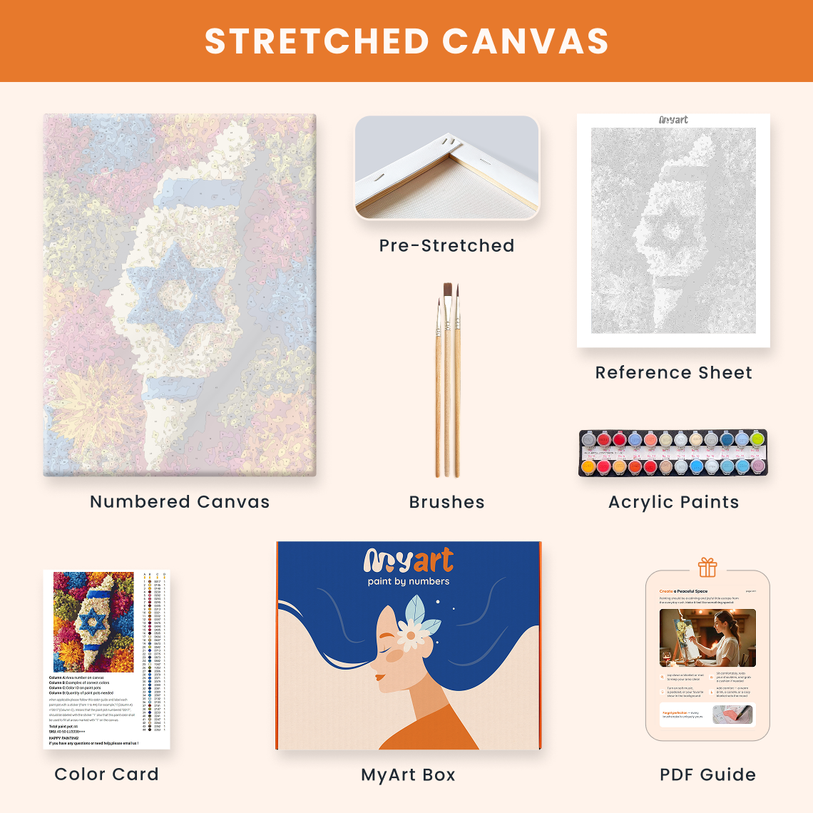- Premium acrylic paint set (pre-mixed and numbered)