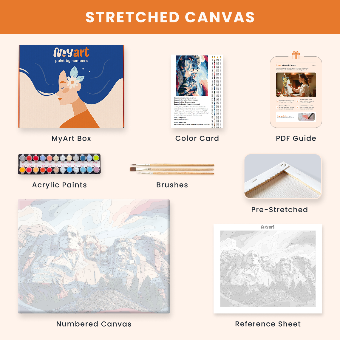 - Premium acrylic paint set (pre-mixed and numbered)