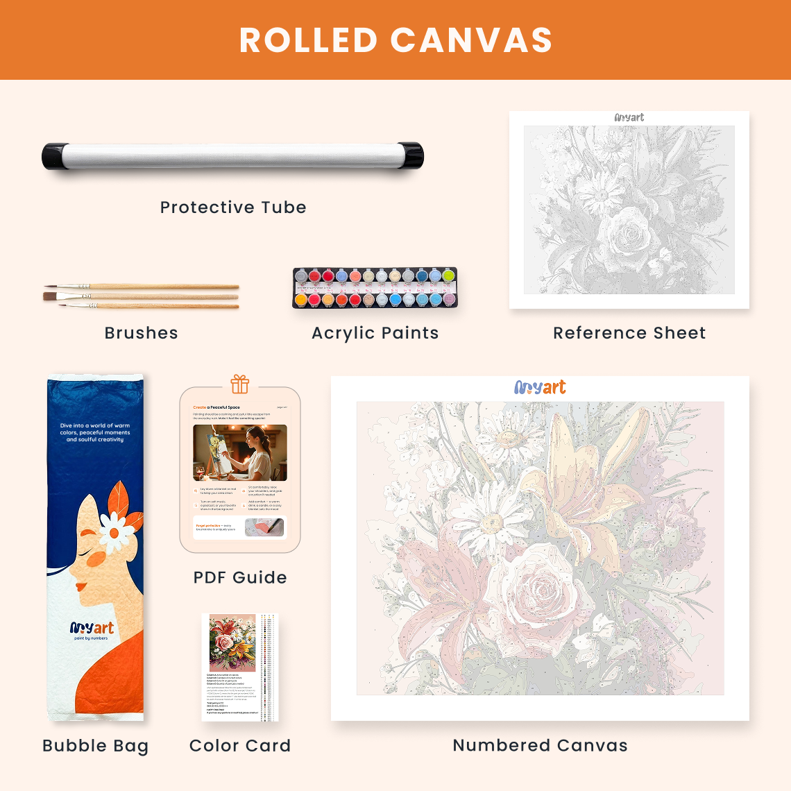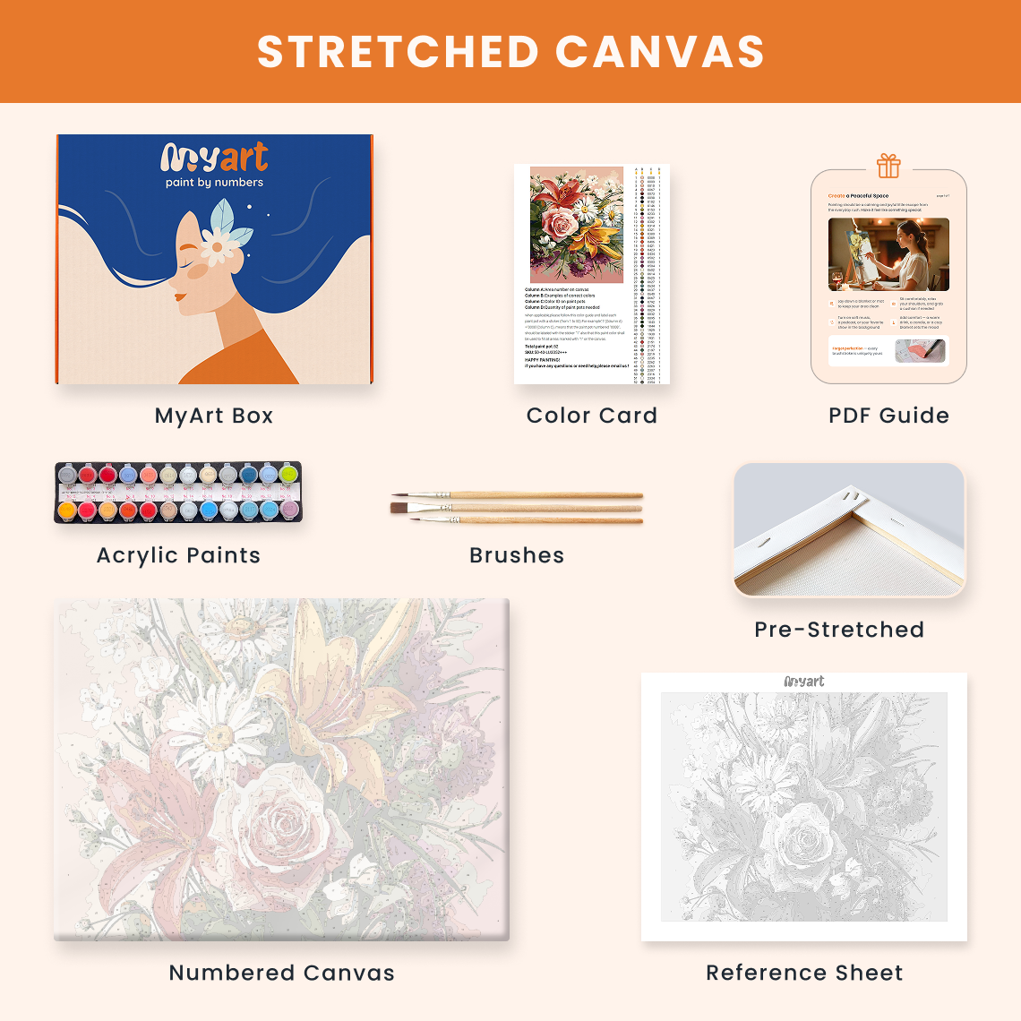 - Premium acrylic paint set (pre-mixed and numbered)