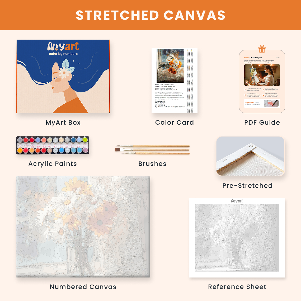 - Premium acrylic paint set (pre-mixed and numbered)