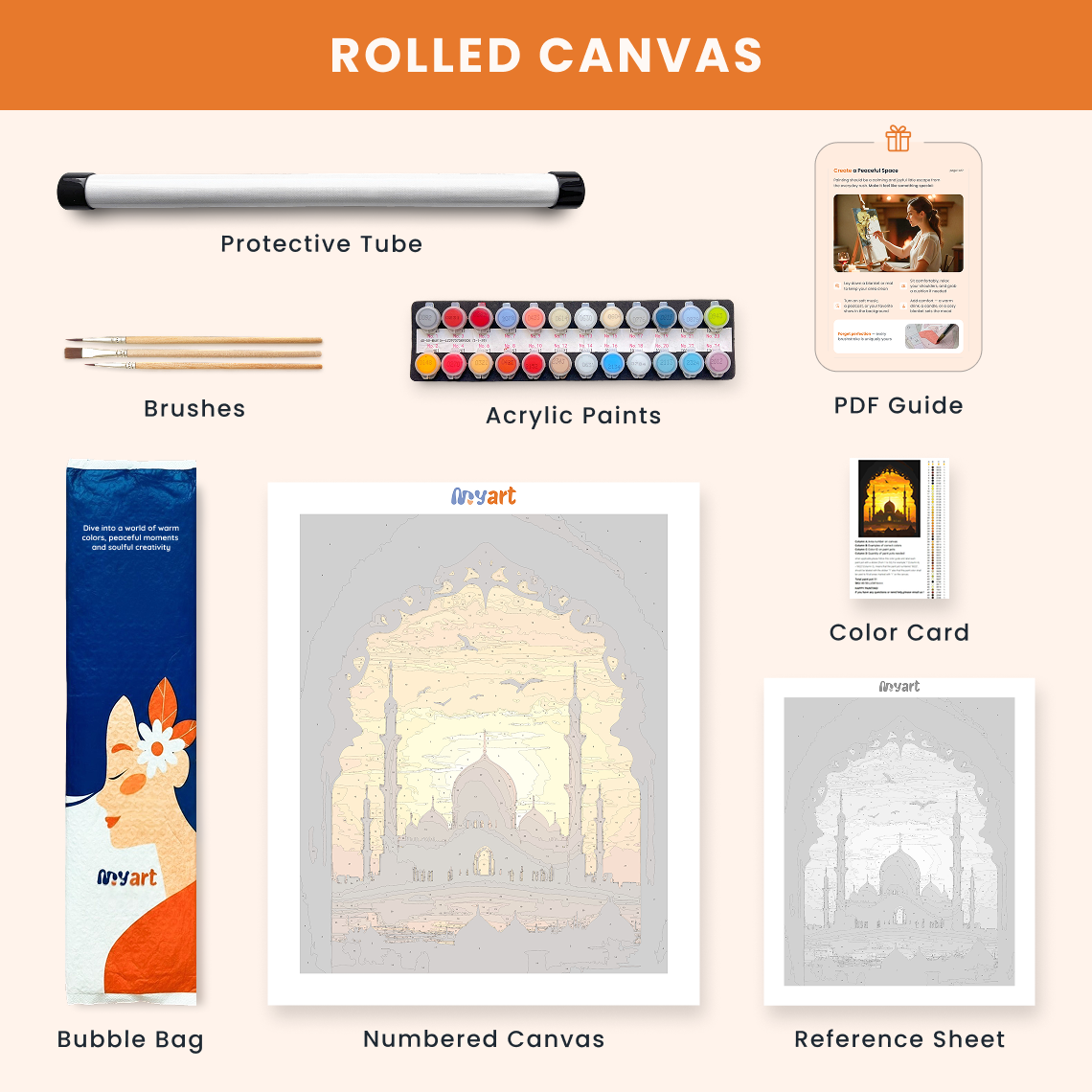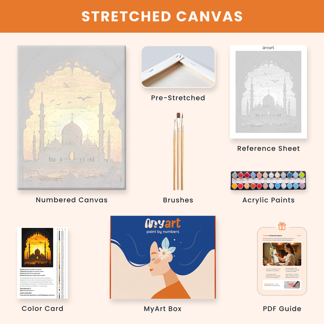 - Premium acrylic paint set (pre-mixed and numbered)