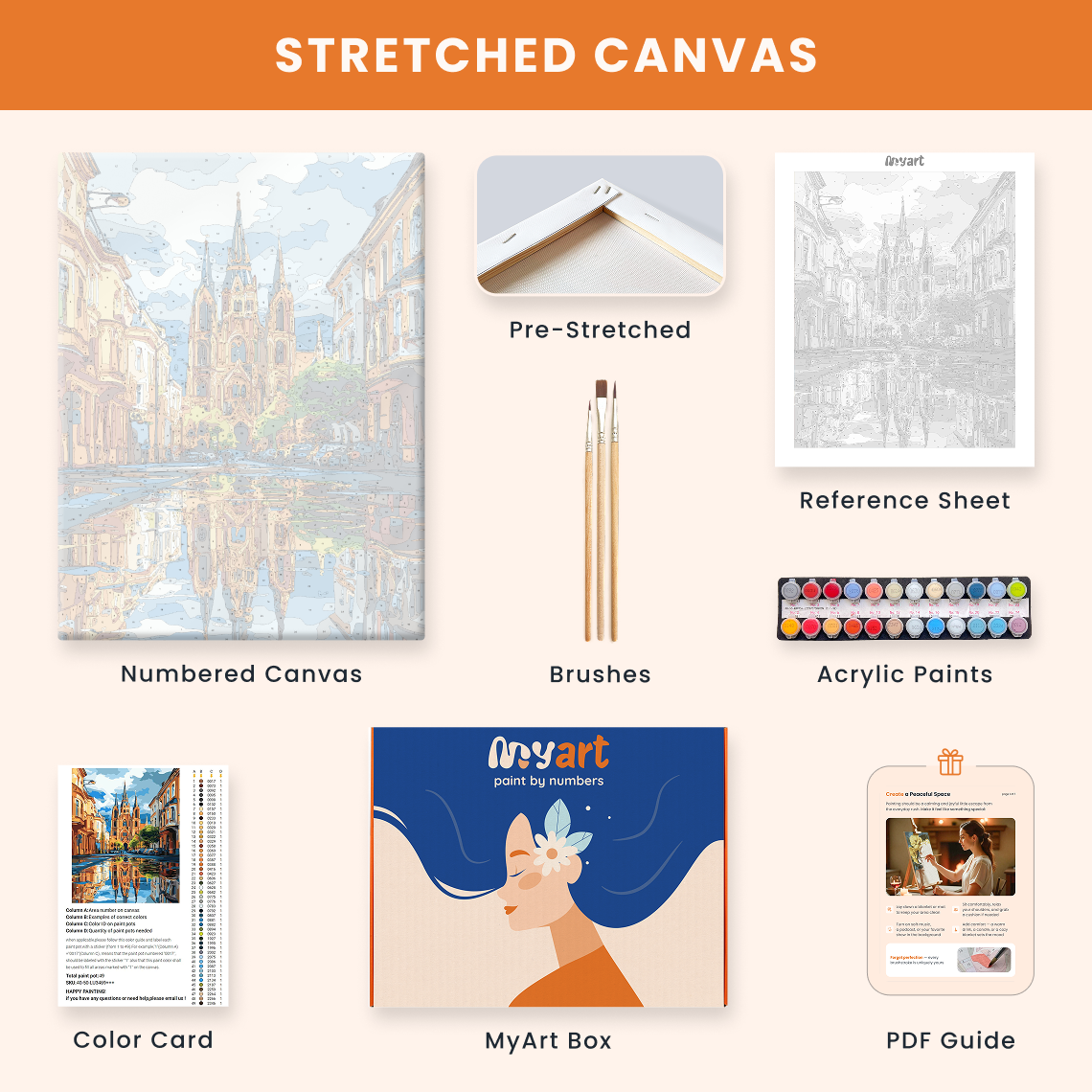 - Premium acrylic paint set (pre-mixed and numbered)