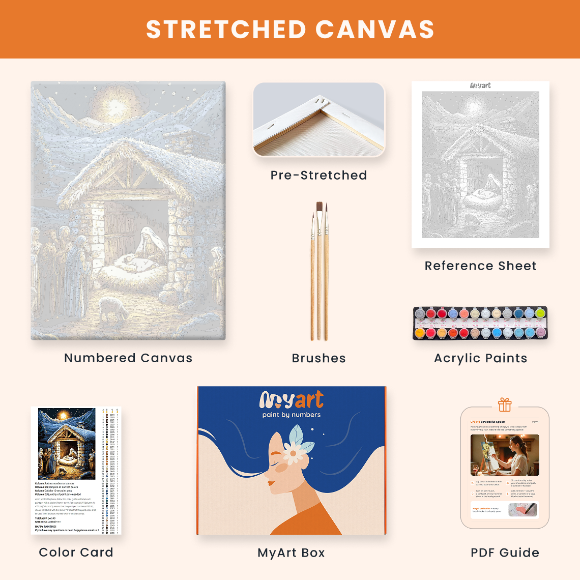 - Premium acrylic paint set (pre-mixed and numbered)