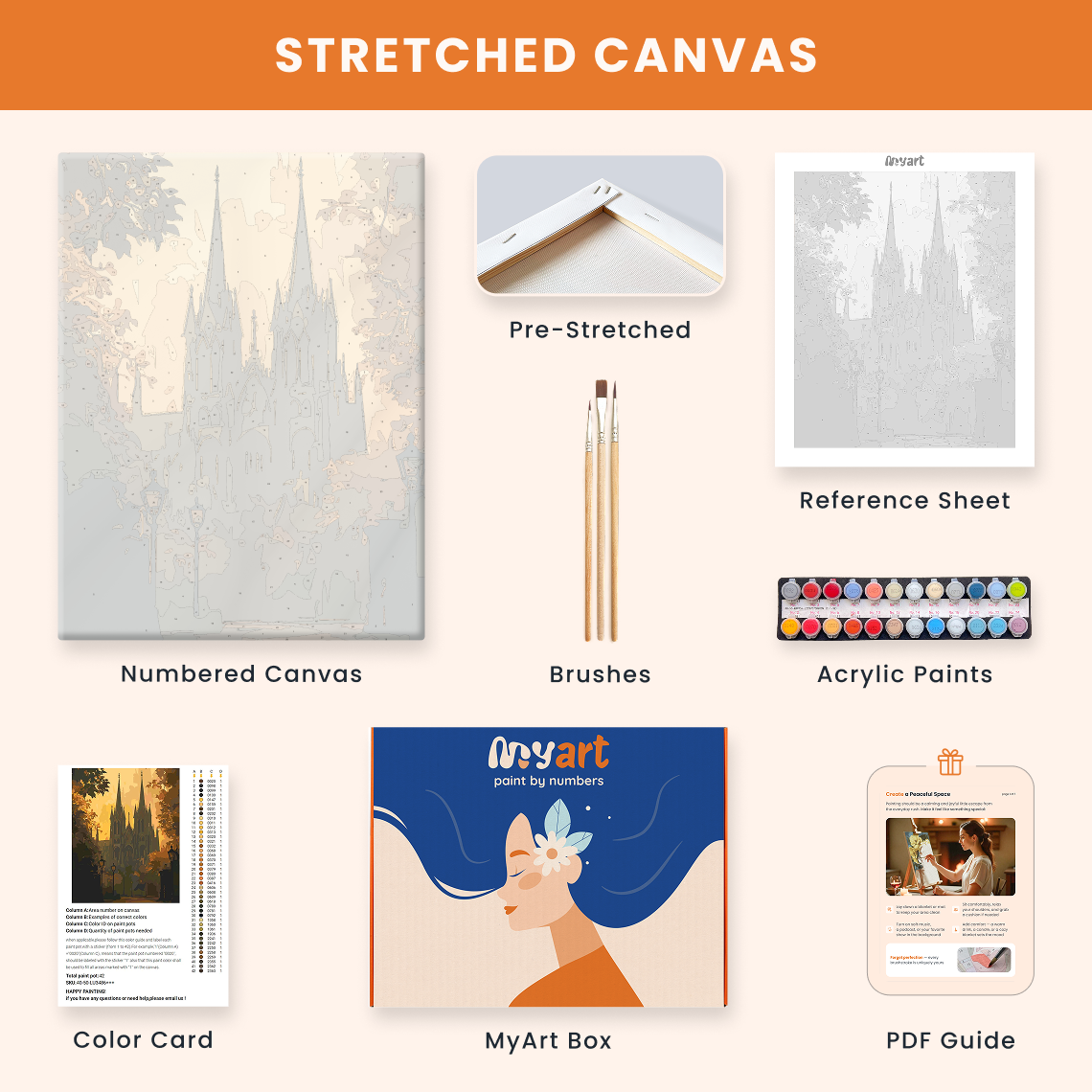 - Premium acrylic paint set (pre-mixed and numbered)