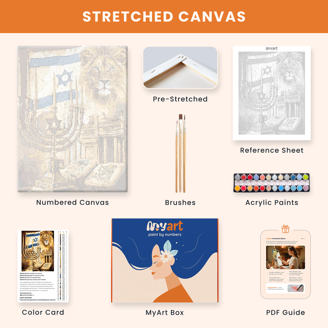 - Premium acrylic paint set (pre-mixed and numbered)