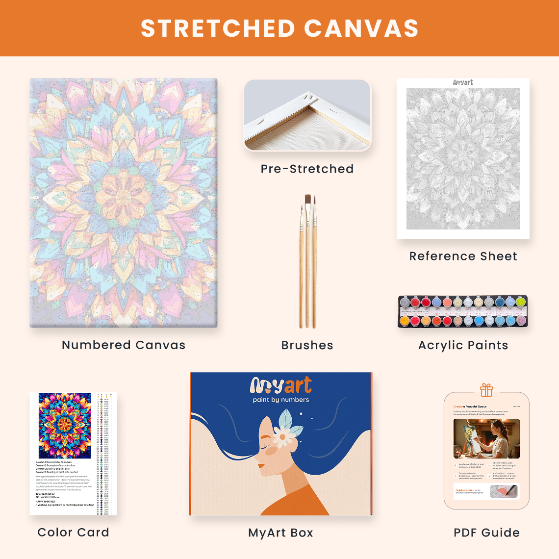 - Premium acrylic paint set (pre-mixed and numbered)