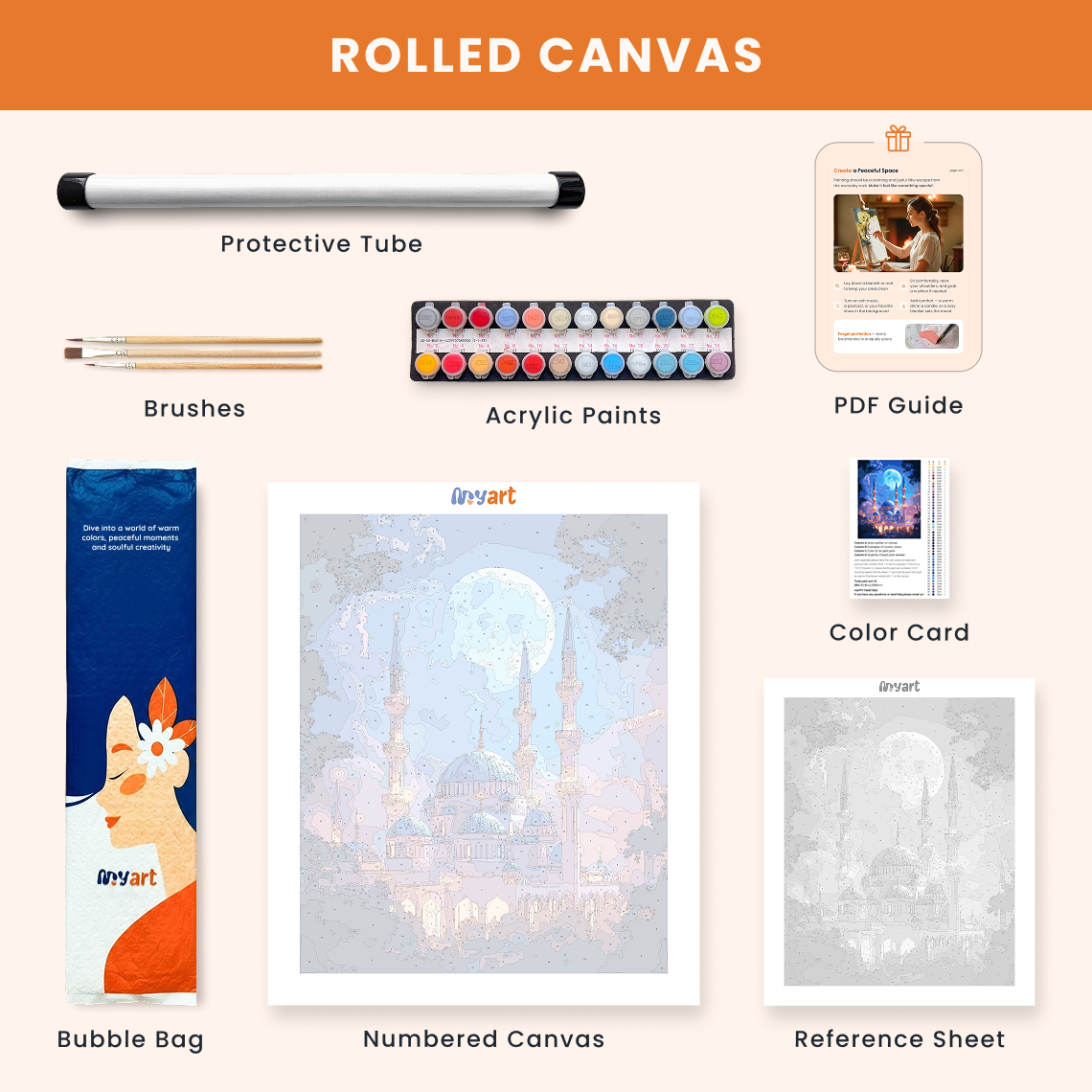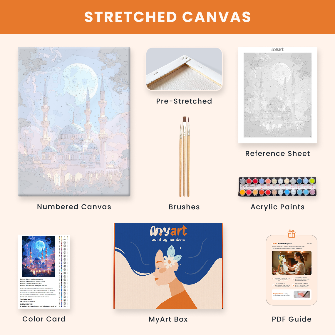 - Premium acrylic paint set (pre-mixed and numbered)