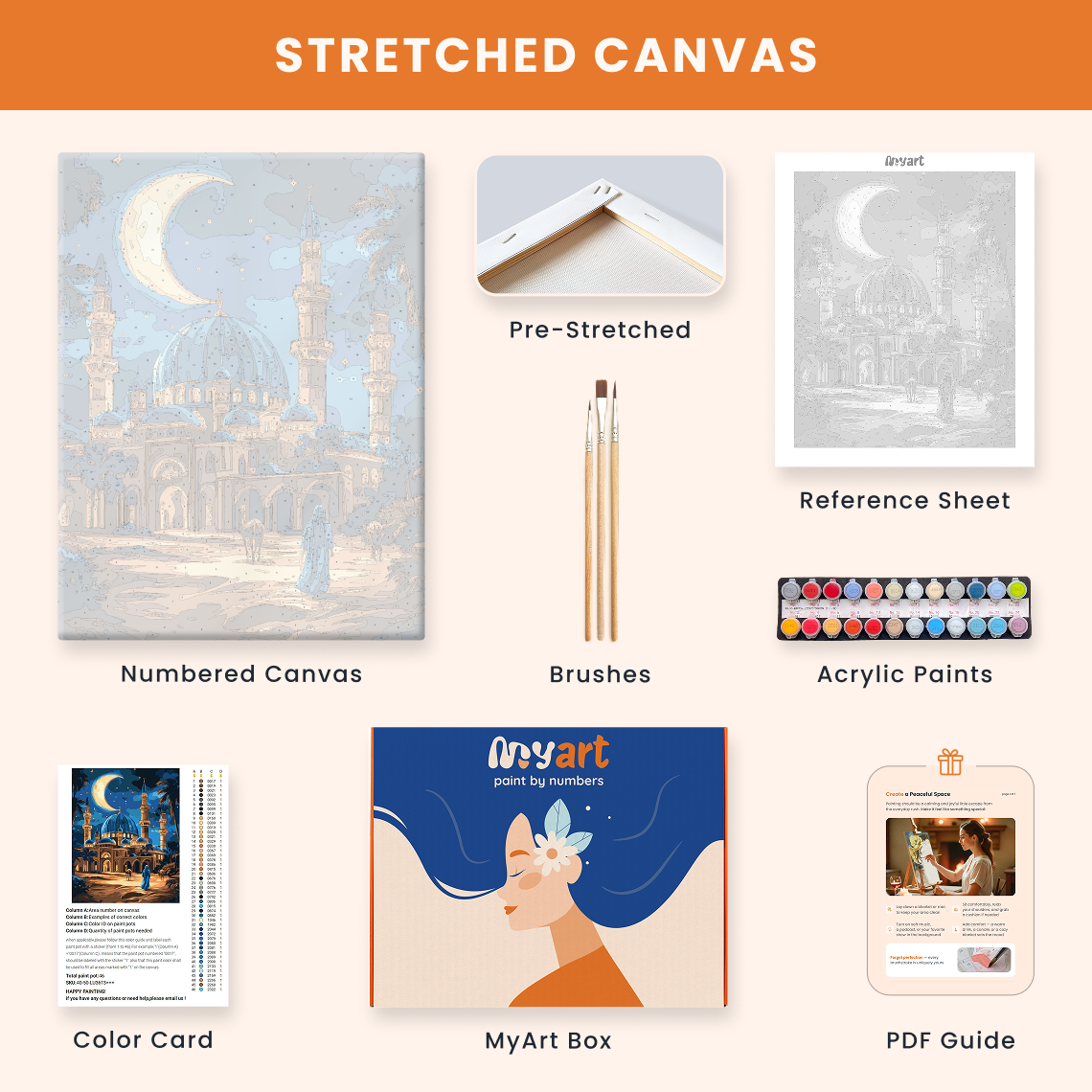 - Premium acrylic paint set (pre-mixed and numbered)