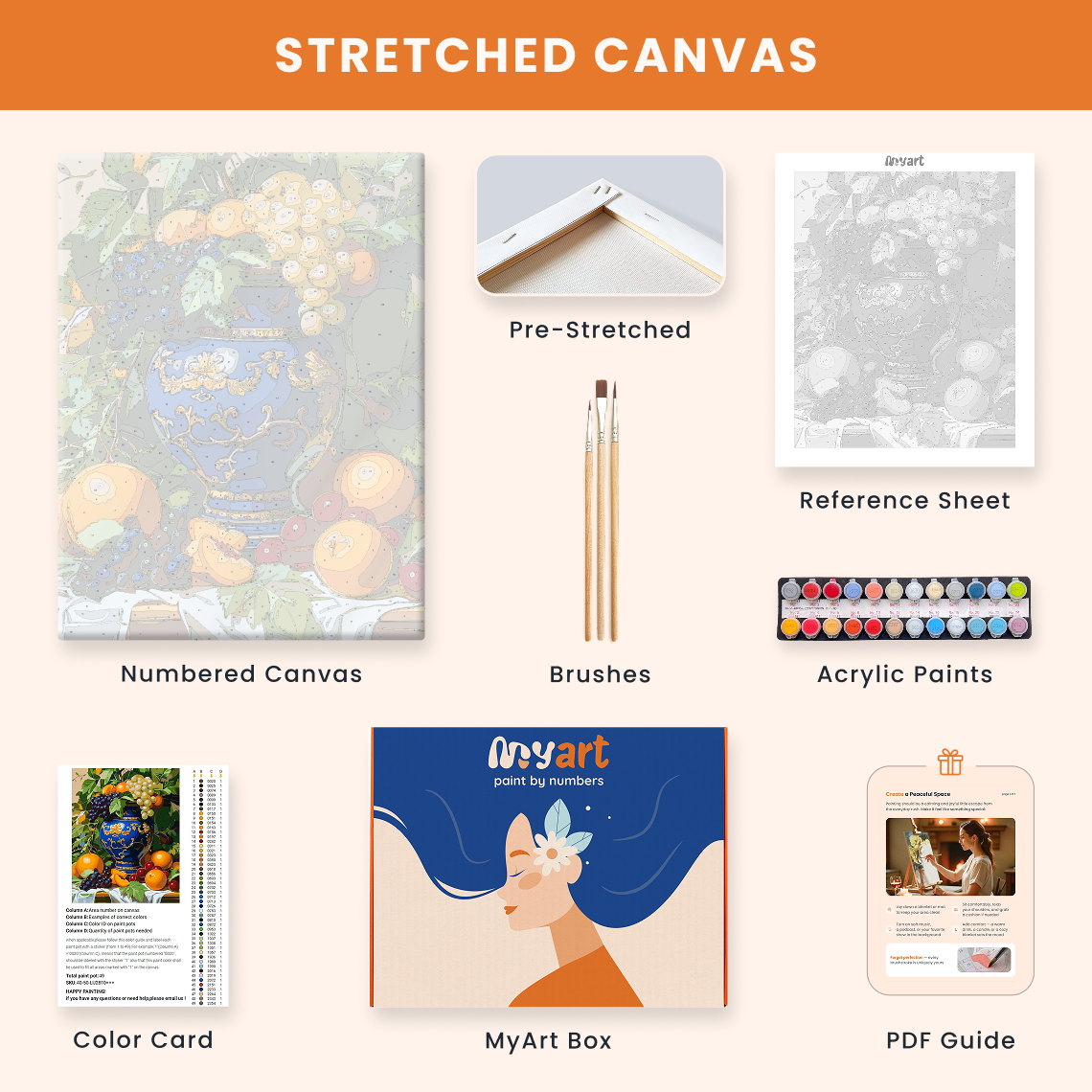 - Premium acrylic paint set (pre-mixed and numbered)