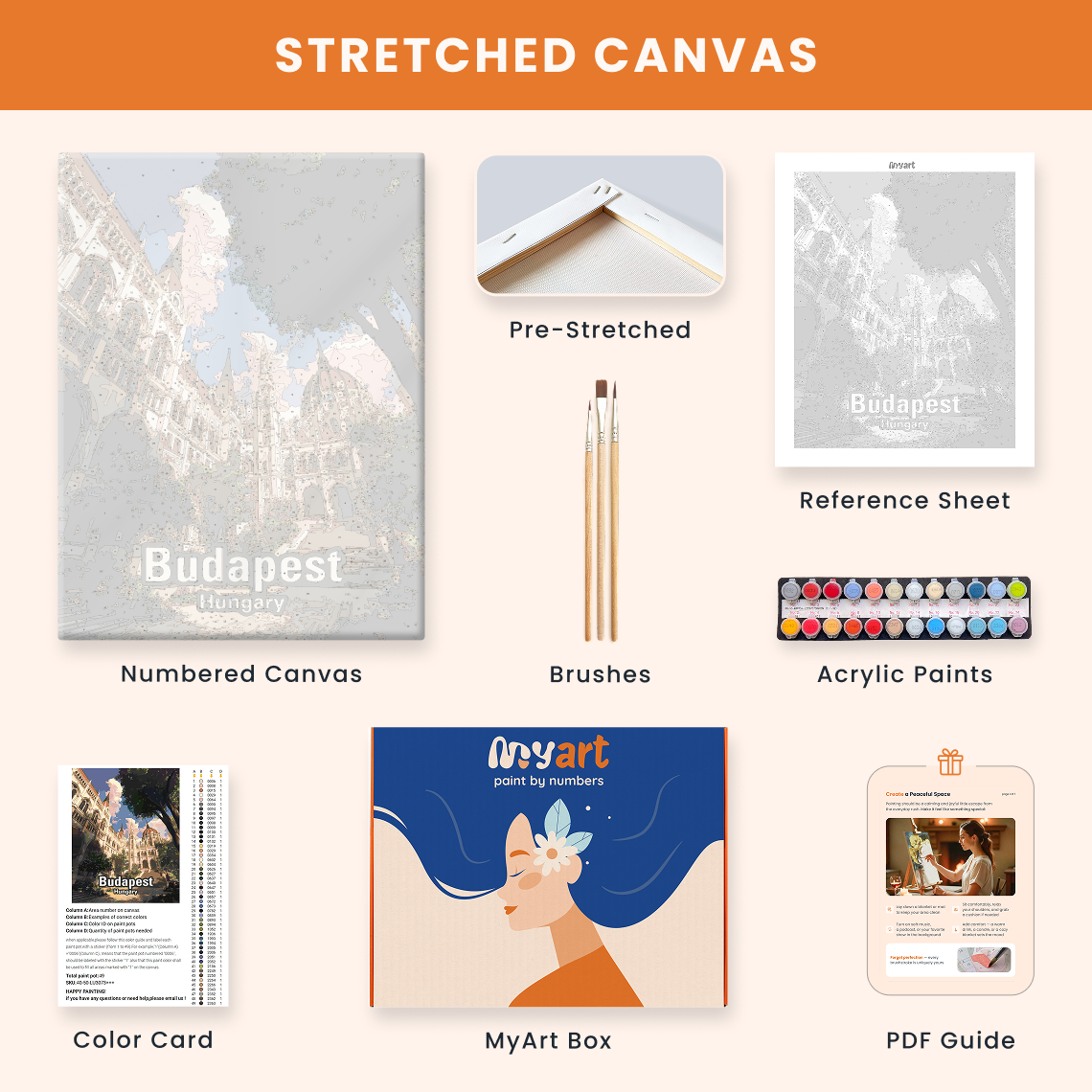 - Premium acrylic paint set (pre-mixed and numbered)