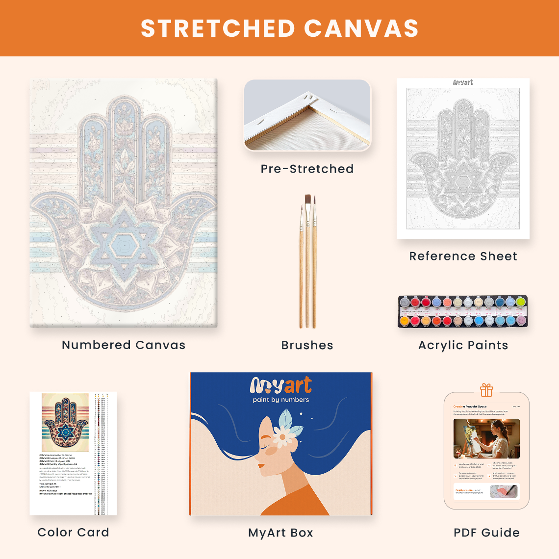 - Premium acrylic paint set (pre-mixed and numbered)