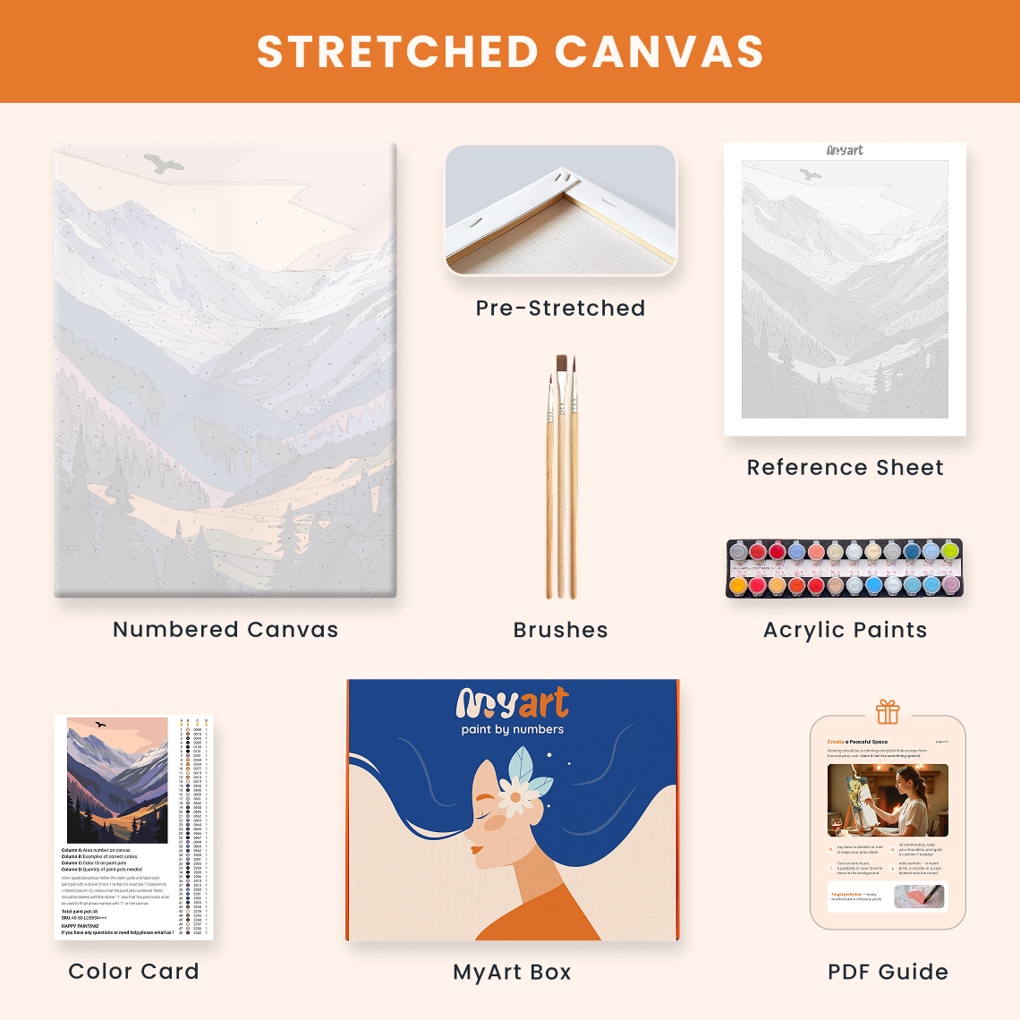 - Premium acrylic paint set (pre-mixed and numbered)