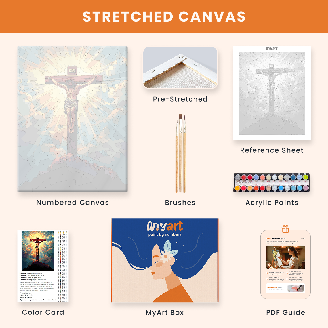 - Premium acrylic paint set (pre-mixed and numbered)