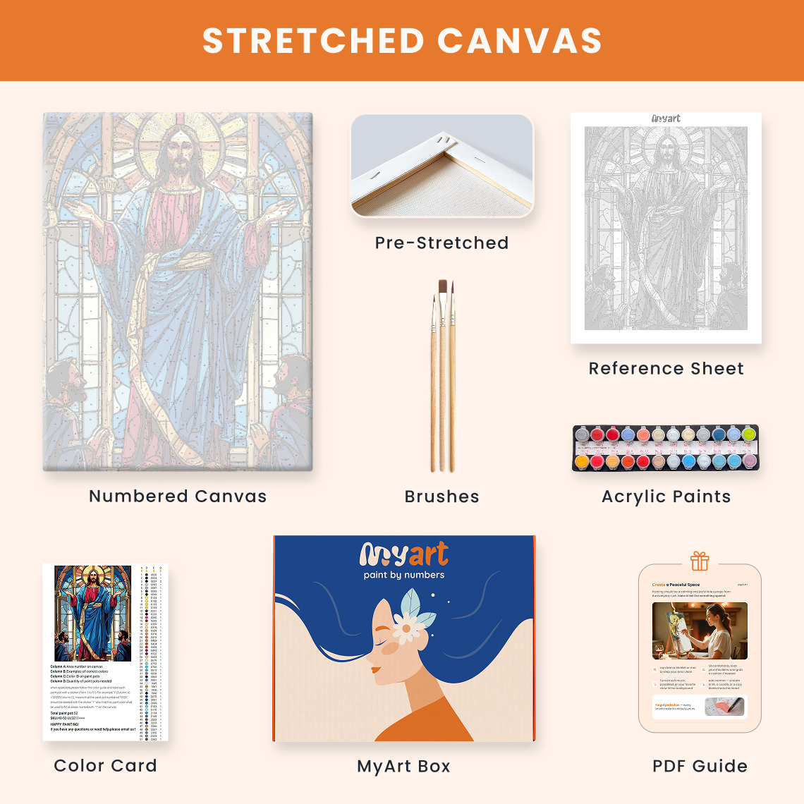 - Premium acrylic paint set (pre-mixed and numbered)