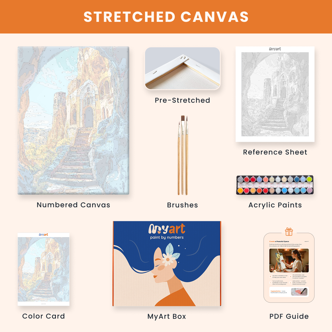 - Premium acrylic paint set (pre-mixed and numbered)