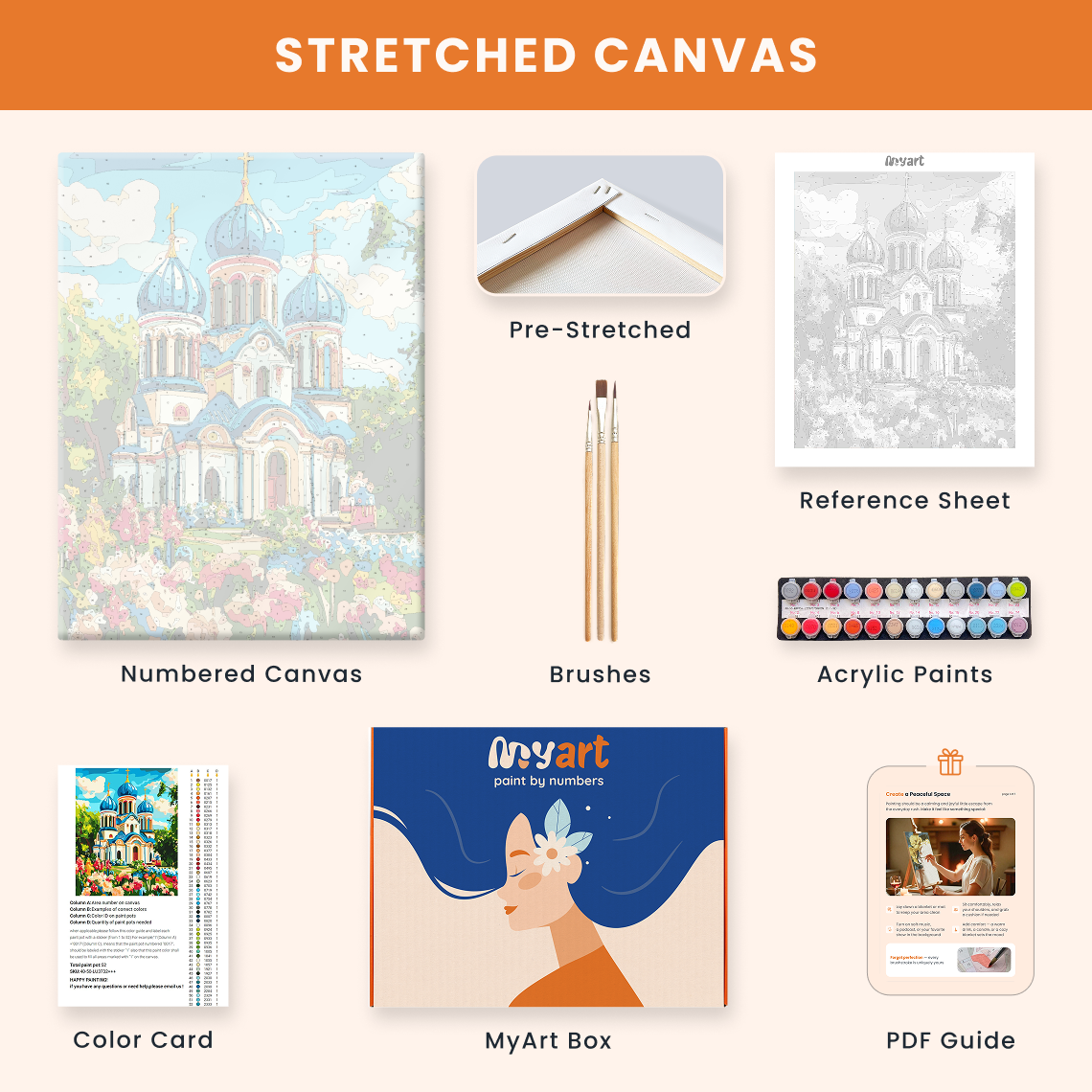 - Premium acrylic paint set (pre-mixed and numbered)