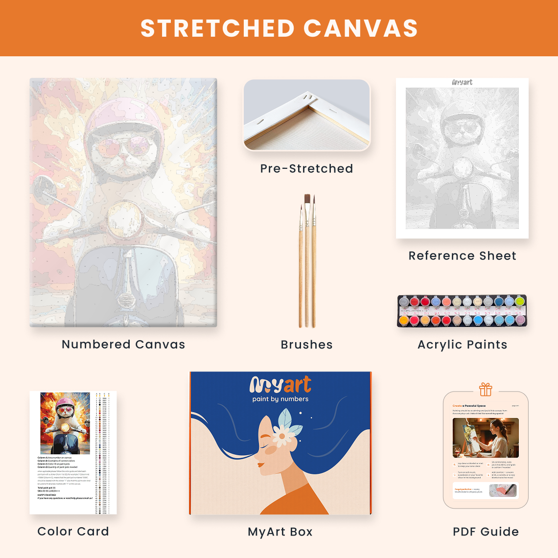 - Premium acrylic paint set (pre-mixed and numbered)