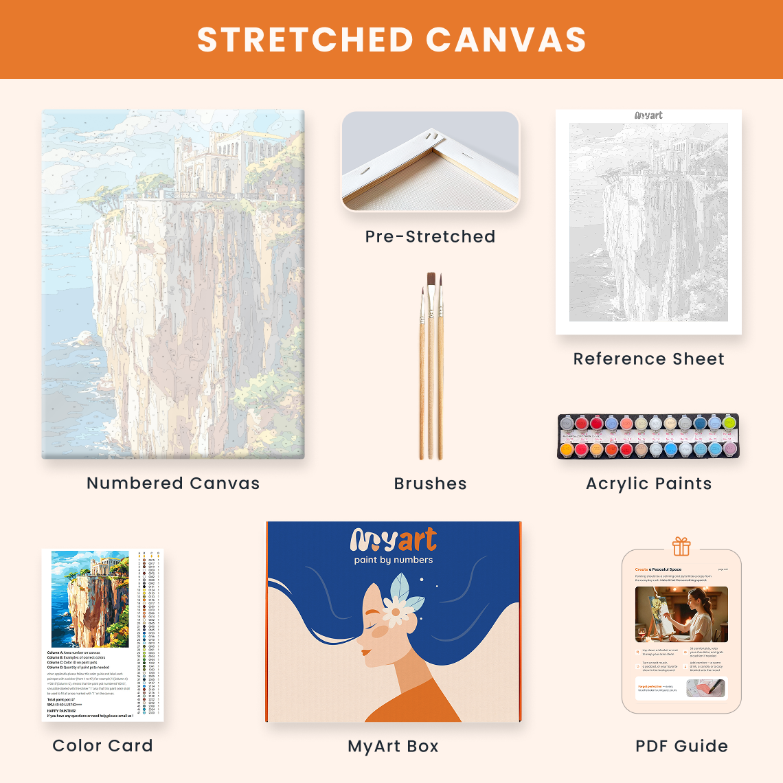 - Premium acrylic paint set (pre-mixed and numbered)