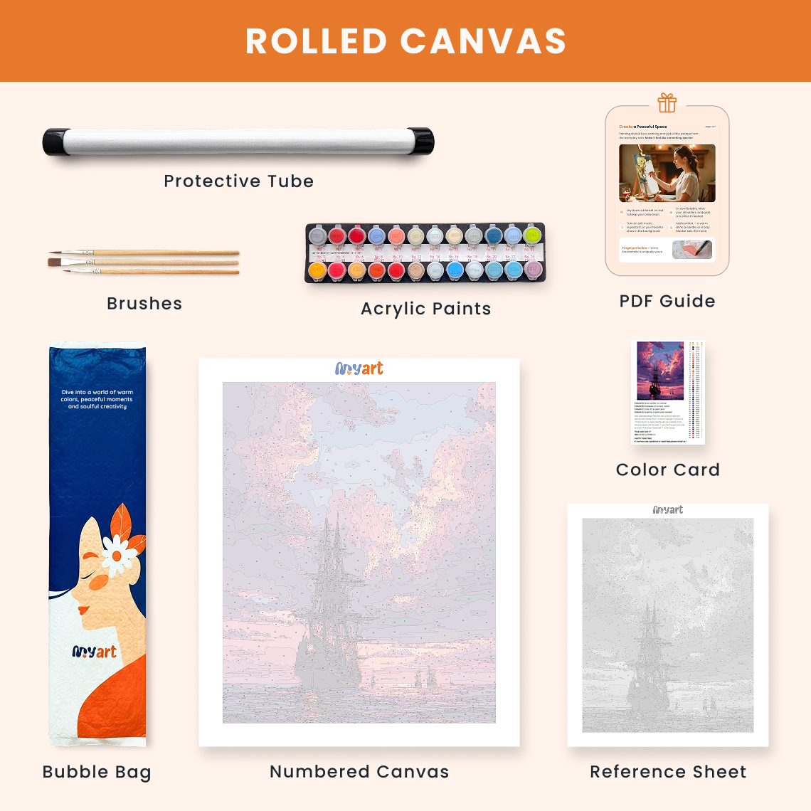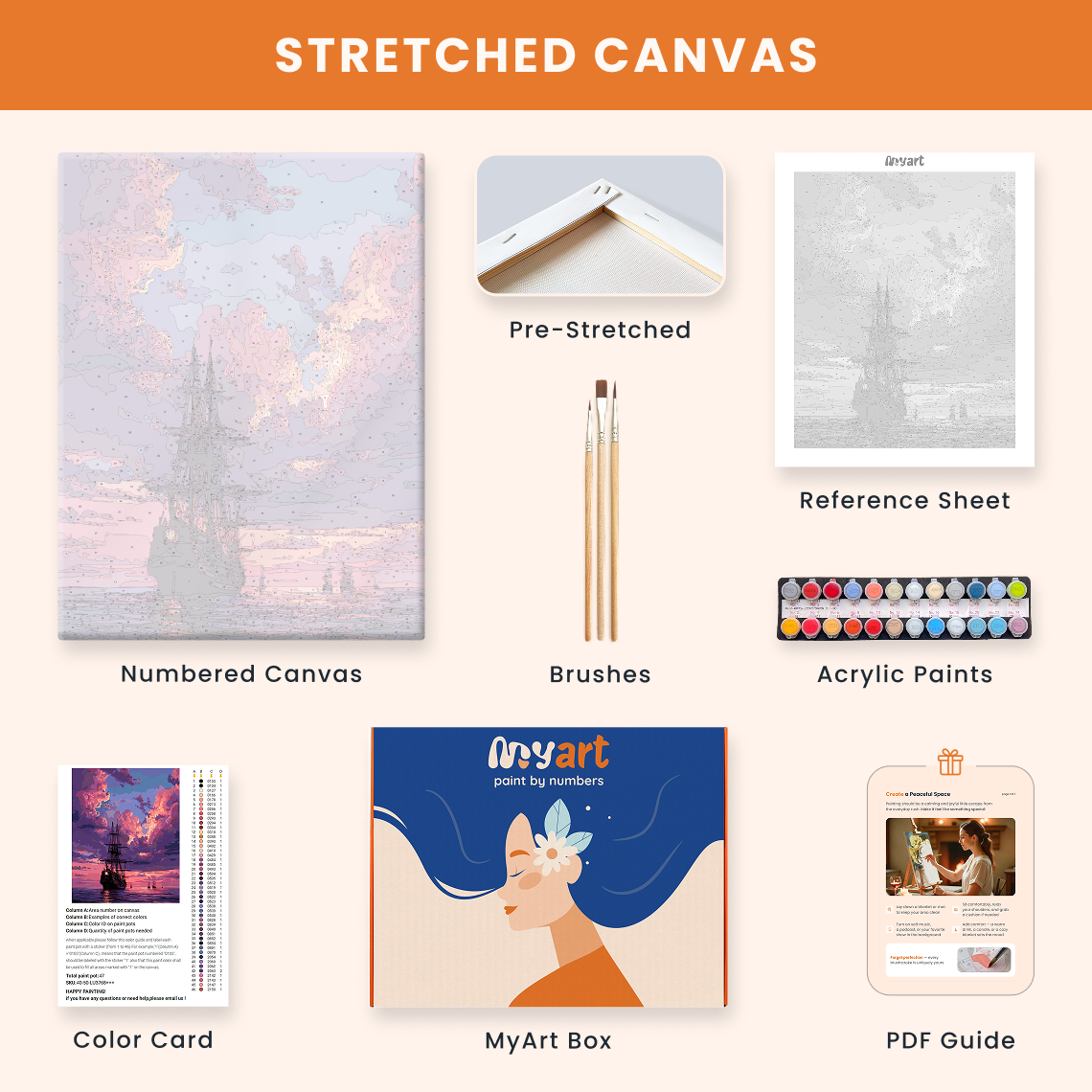 - Premium acrylic paint set (pre-mixed and numbered)