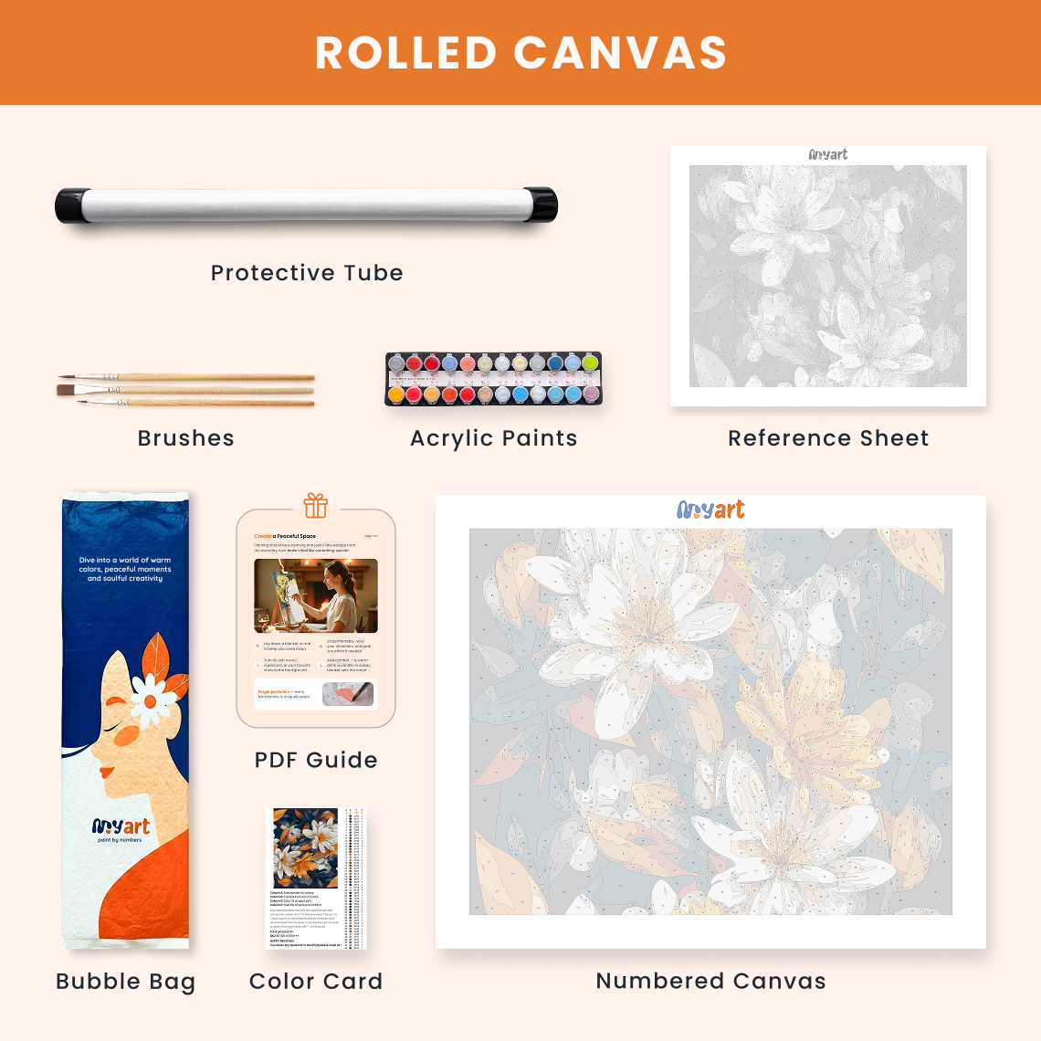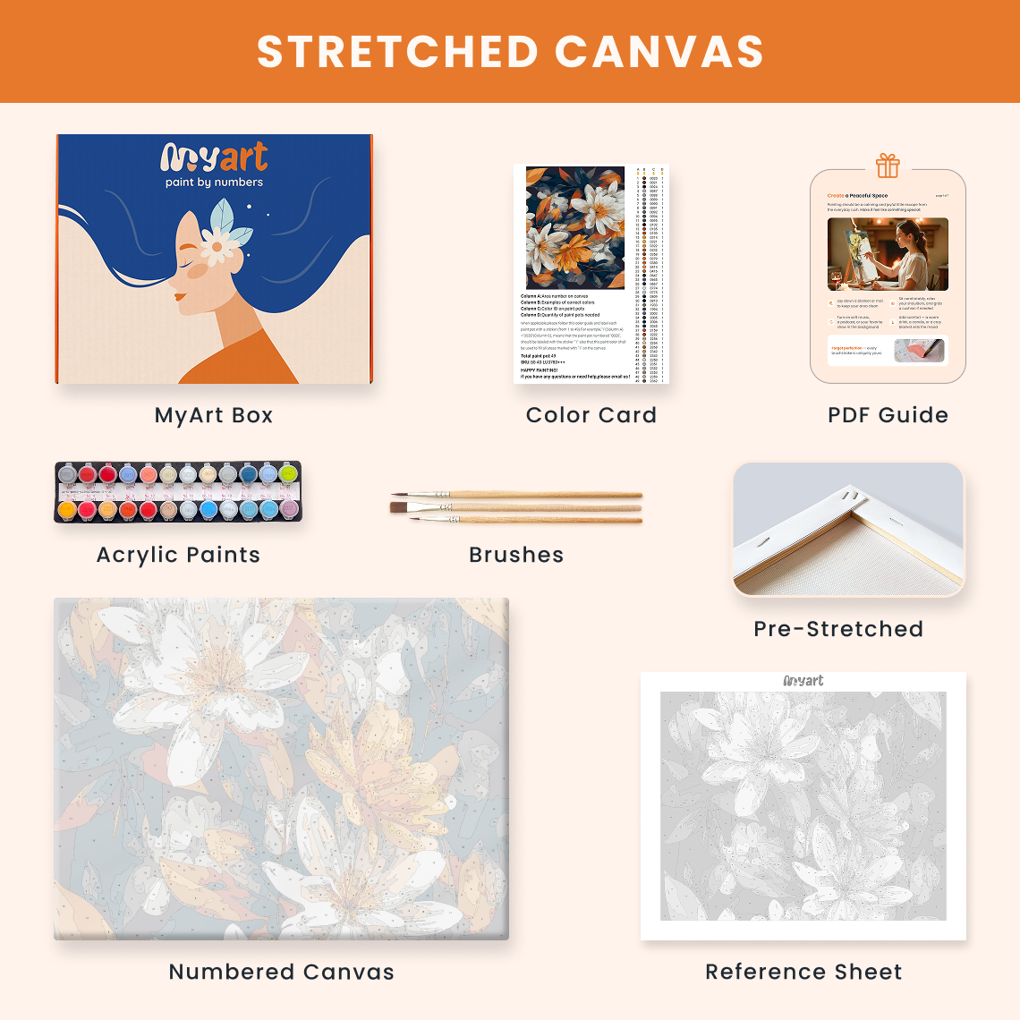 - Premium acrylic paint set (pre-mixed and numbered)