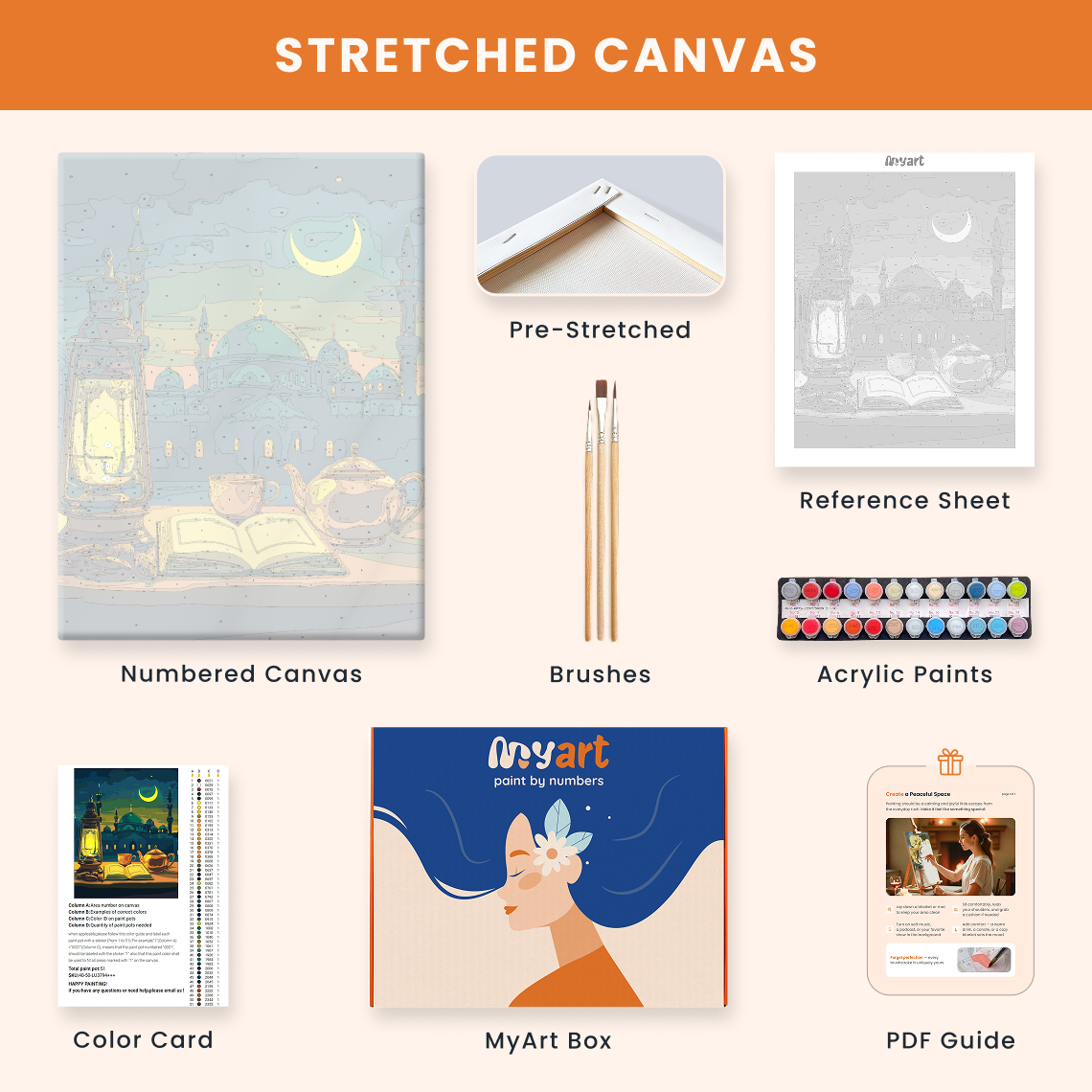 The canvas is pre-stretched on a wooden frame — ready to hang when finished.