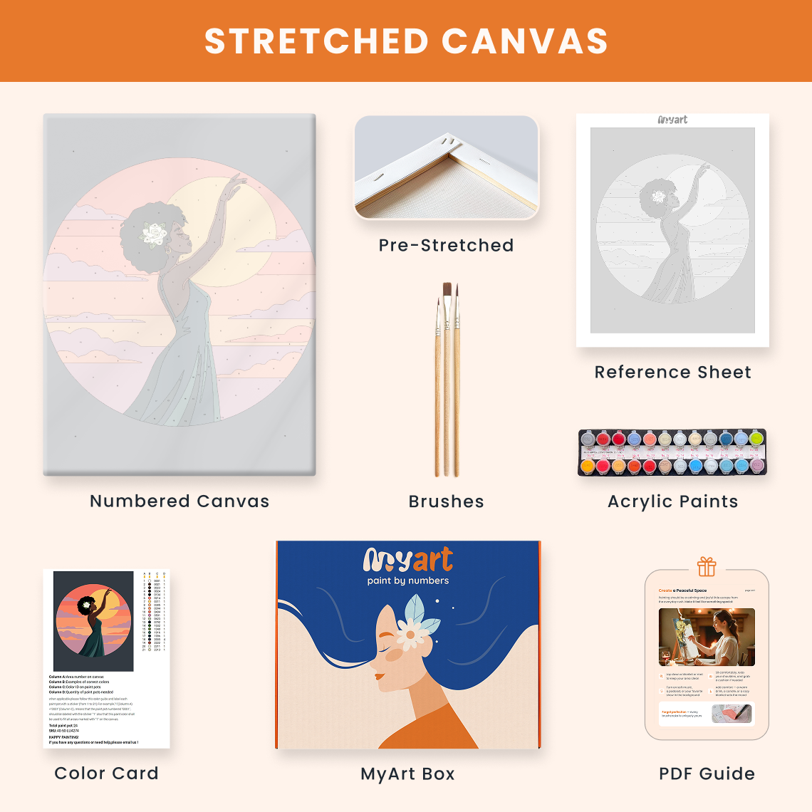 - Premium acrylic paint set (pre-mixed and numbered)