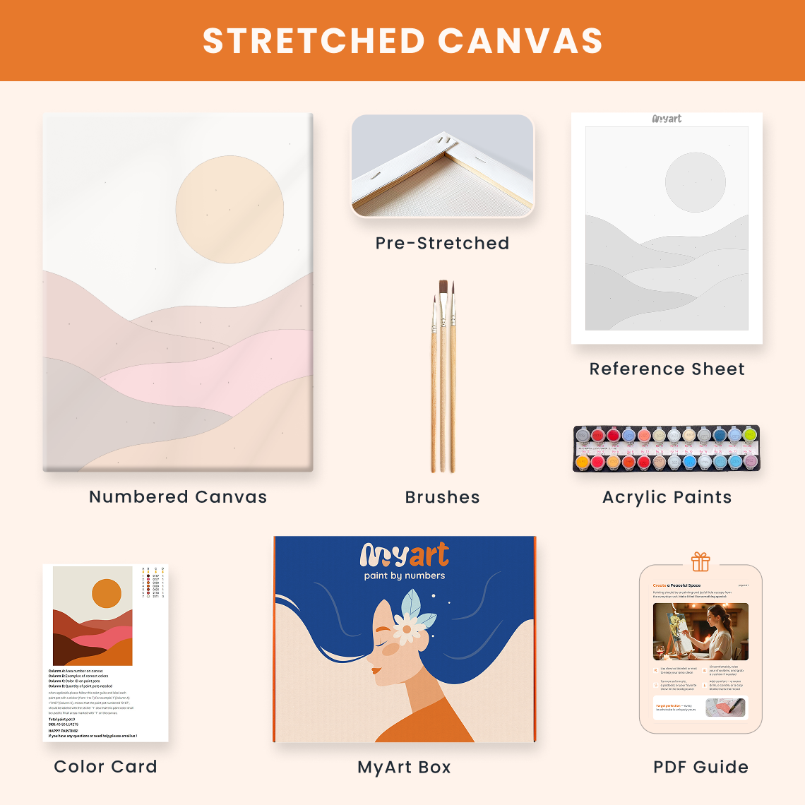 - Premium acrylic paint set (pre-mixed and numbered)