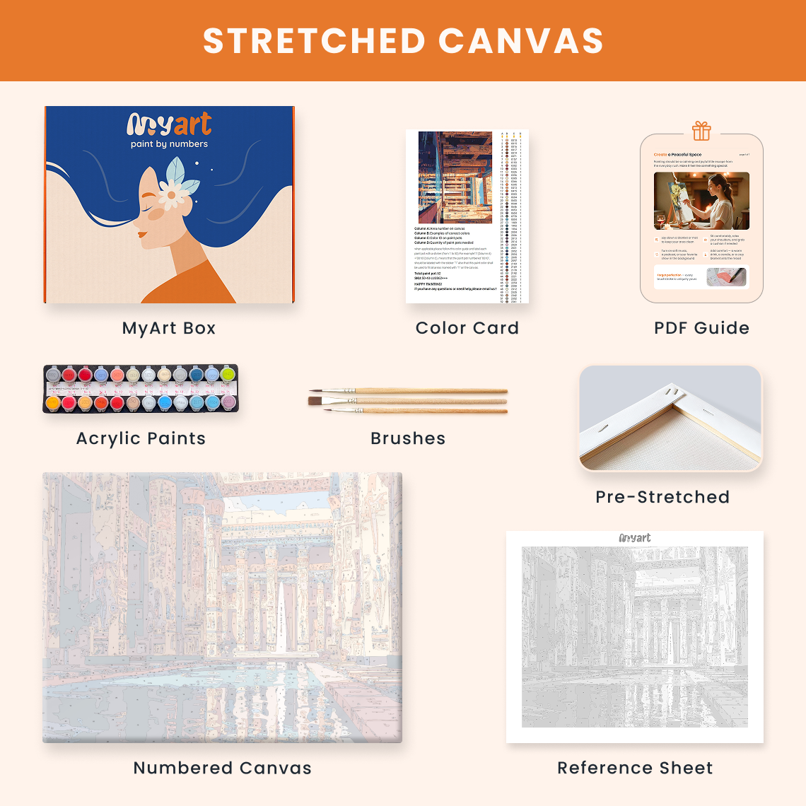 The canvas is pre-stretched on a wooden frame — ready to hang when finished.