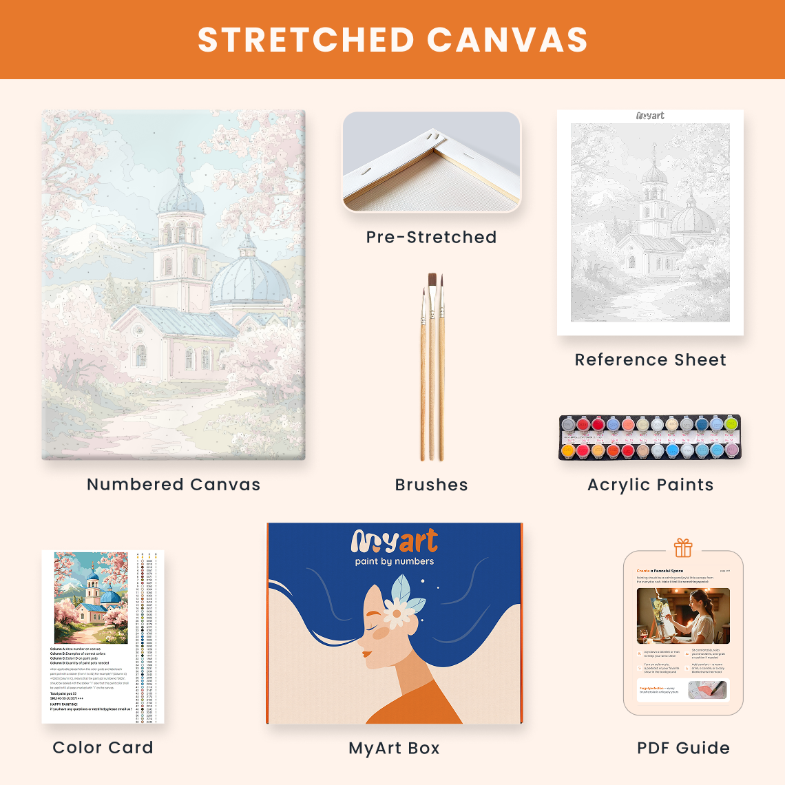 - Premium acrylic paint set (pre-mixed and numbered)