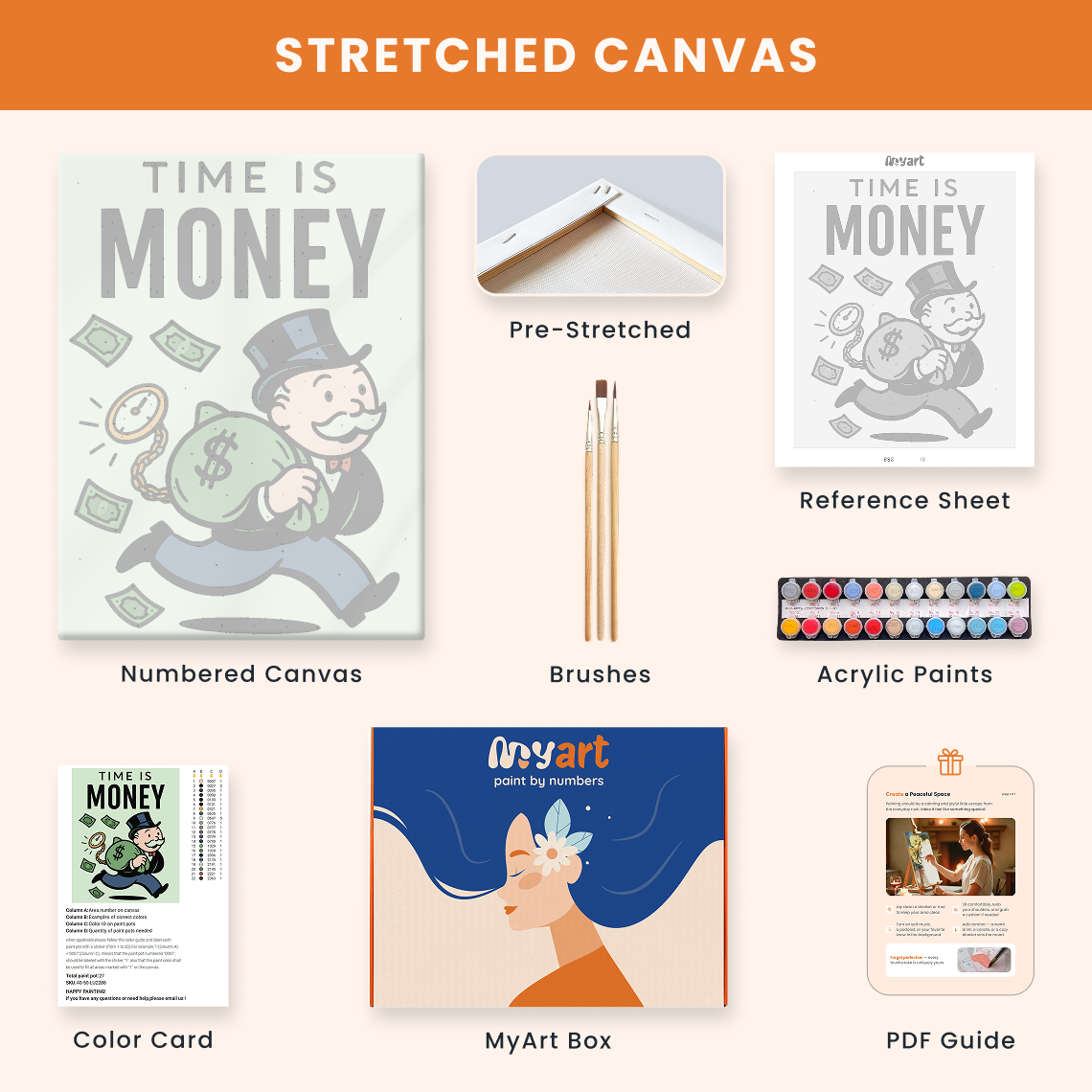 The canvas is pre-stretched on a wooden frame — ready to hang when finished.
