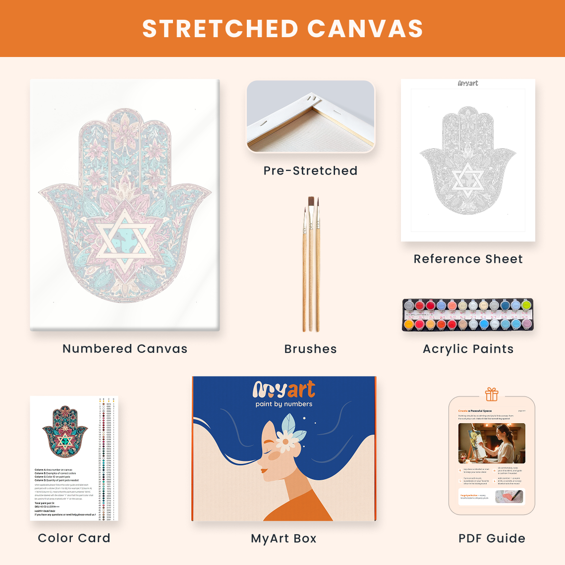 The canvas is pre-stretched on a wooden frame — ready to hang when finished.