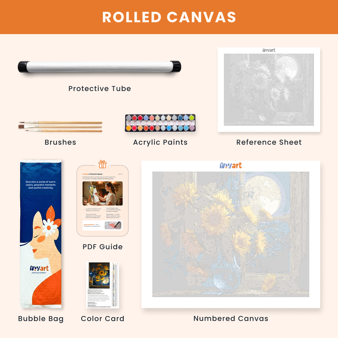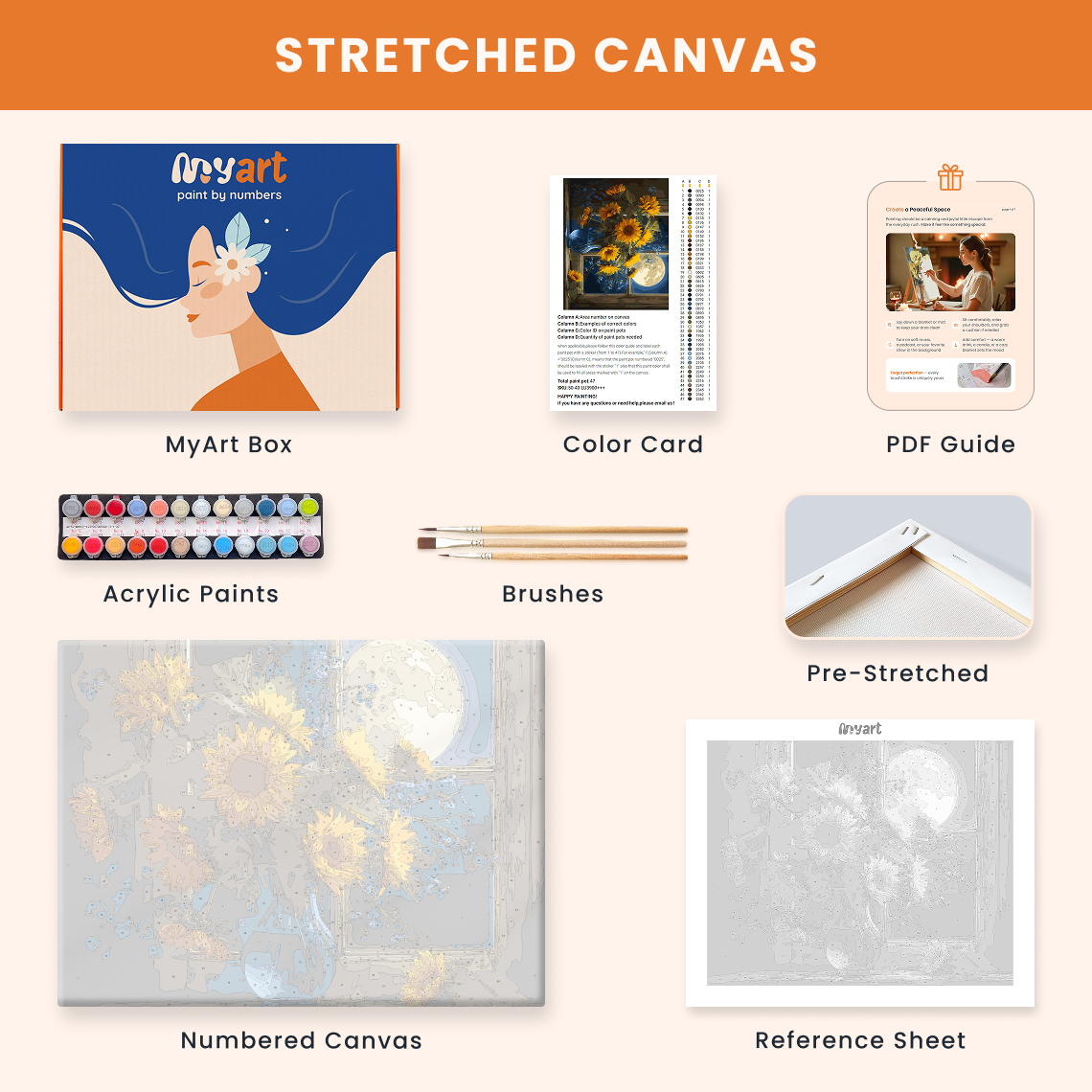 - Premium acrylic paint set (pre-mixed and numbered)