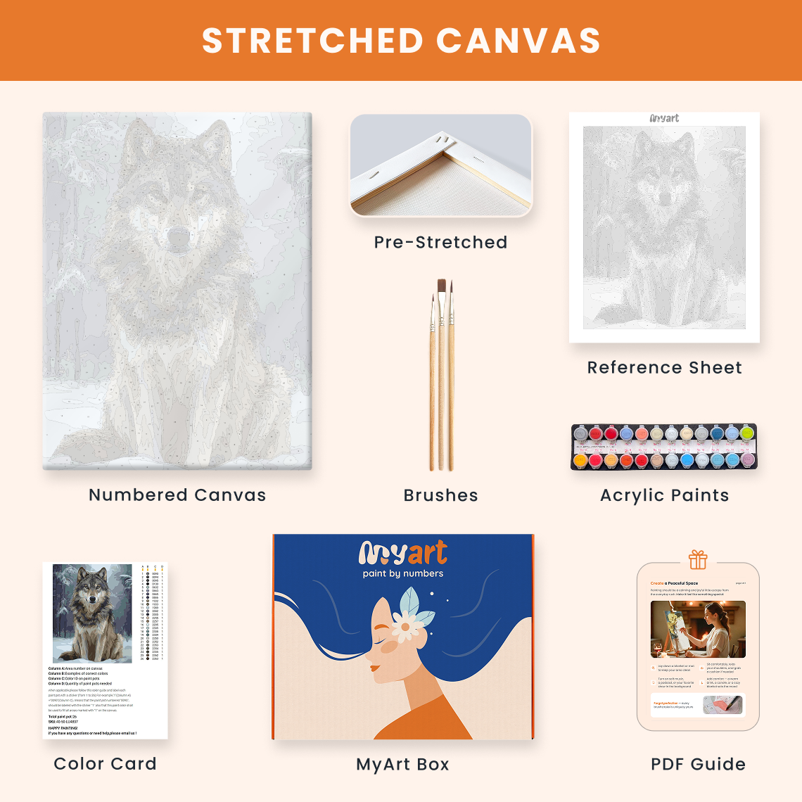 - Premium acrylic paint set (pre-mixed and numbered)